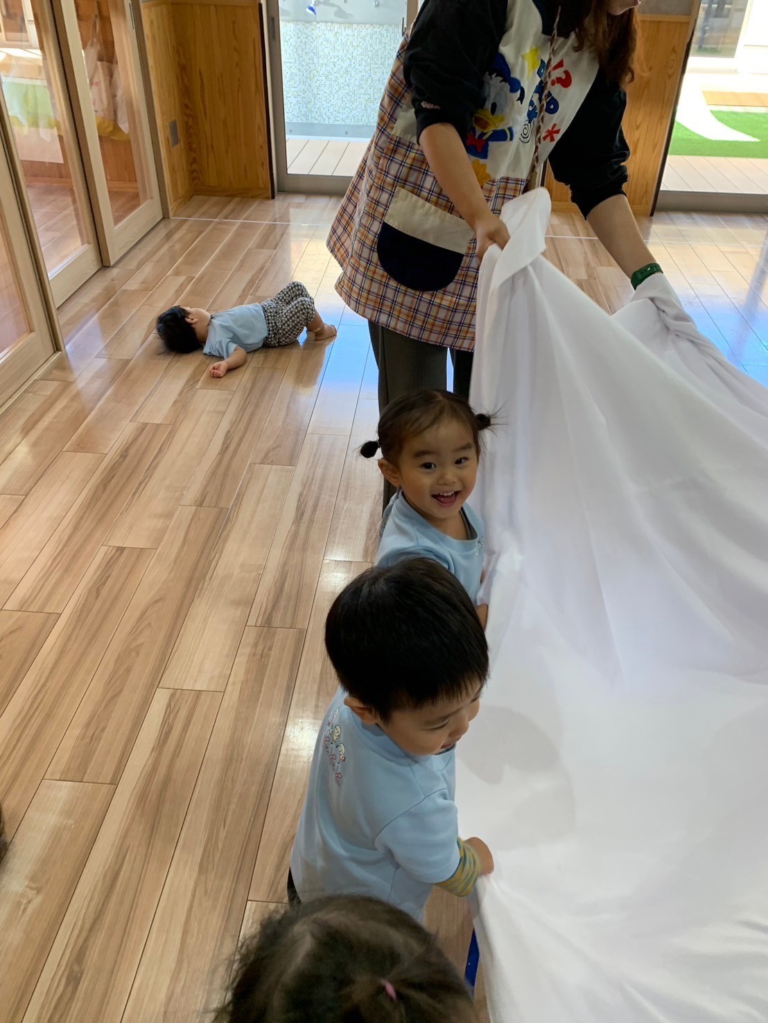 今日はシーツ遊びをしました🩷先生が端を持って大きく上下に動かすと風が起こり、きゃーっと喜ぶ子どもたち🥳