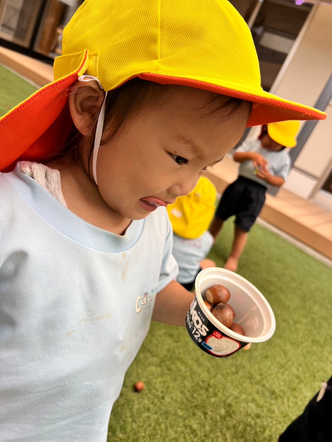 今日の活動は子どもたちに決めてもらいました✨️園庭を選んだりす組さんでしたよ🥰 お兄さん、お姉さんが拾ってきてくれたどんぐりでどんぐり拾いをしました࿉࿉࿉ カップに沢山集めると「アイスー!」と言ってどんぐりアイスを見せてくれたり、「小さいのあったー!」と大きさをお友達と比べてみたり、ウッドデッキに転がすと音が出ることみんなで転がして楽しんだりとどんぐりで色々な遊び方を見つけながら遊ぶことができましたよ🤭🤍しっかりお片付けをしてからお砂場でもたくさん遊びましたよ💖