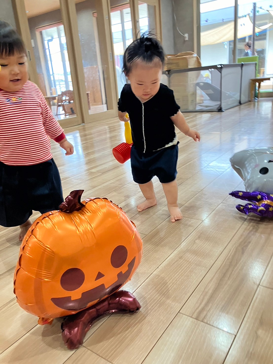 その後は、ハロウィン🎃の風船🎈で遊びましたよ✨ピコピコハンマーを持っておばけを叩いたり、ボールを当てたりしてやっつけましたよ🤗キャンディ🍬ボールを壁にくっつけたり剥いだりと楽しみました🎶