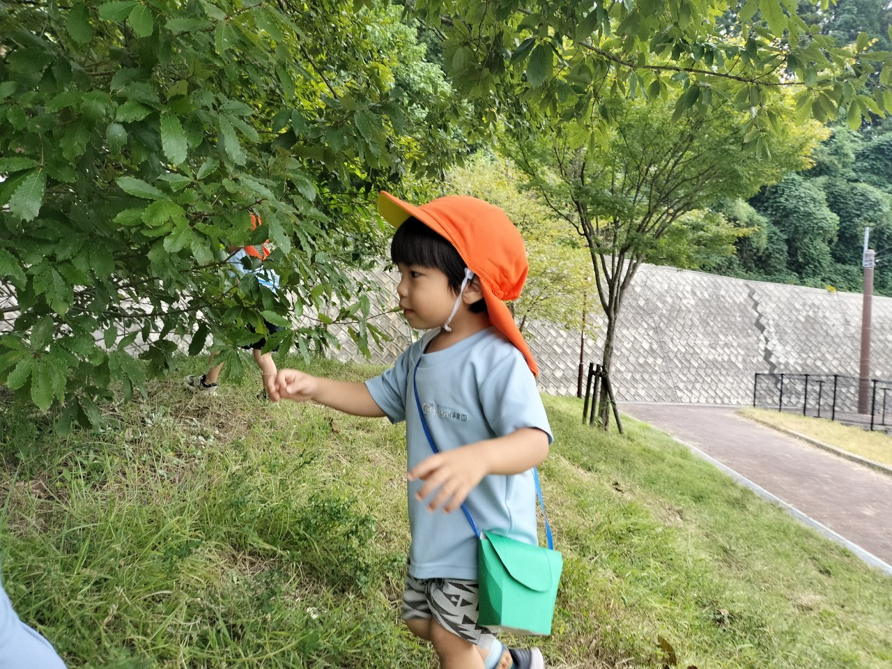 広場について、水分補給をした後にお散歩バックをもらって小高い山🏔️でどんぐり探しを開始、「あ、ここにもどんぐりがあったよ🤭」とお友達と夢中で探していたぱんだぐみさんでした。