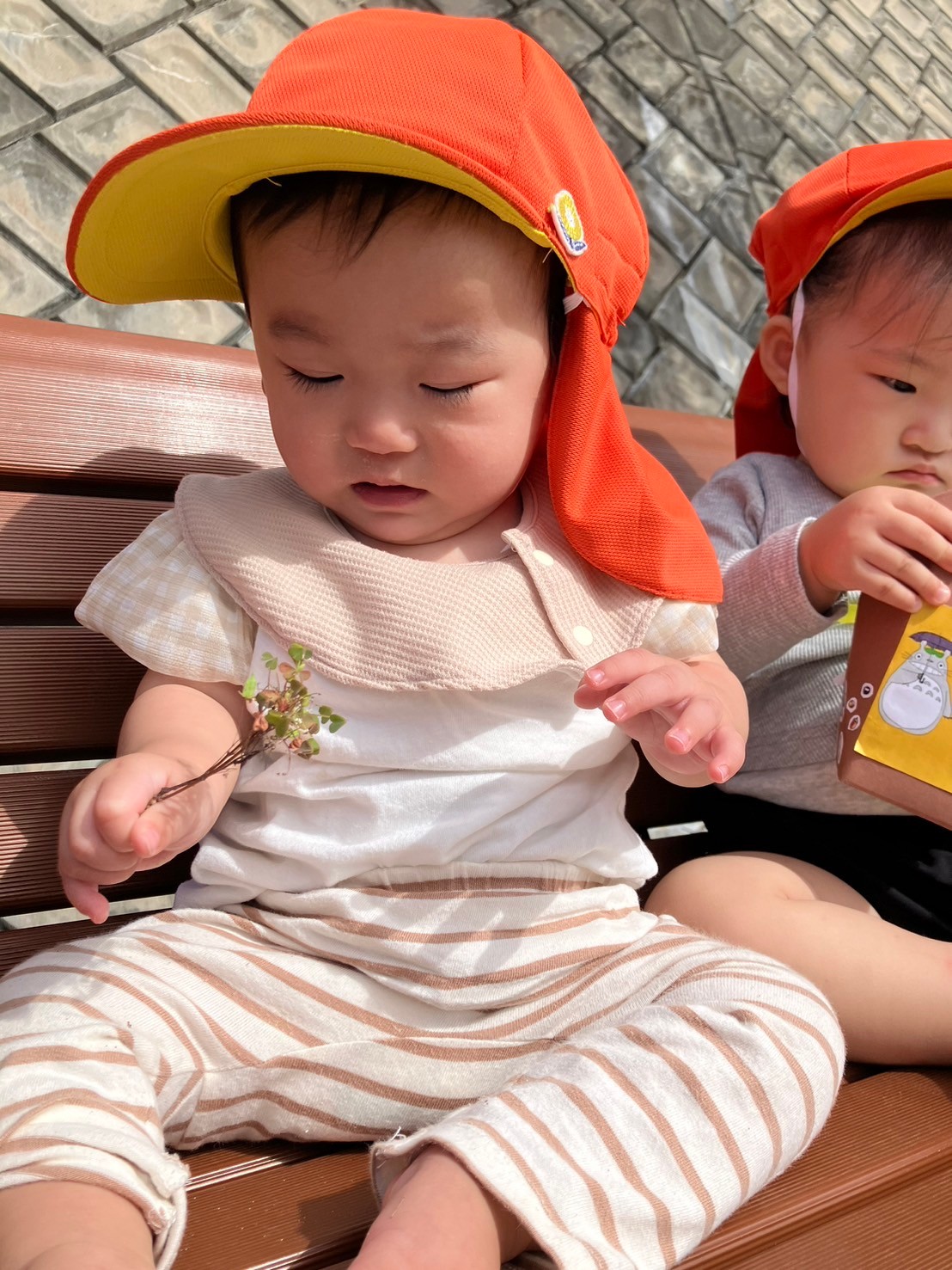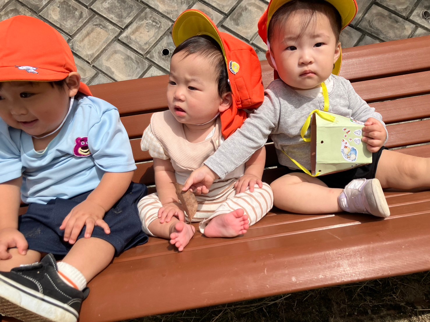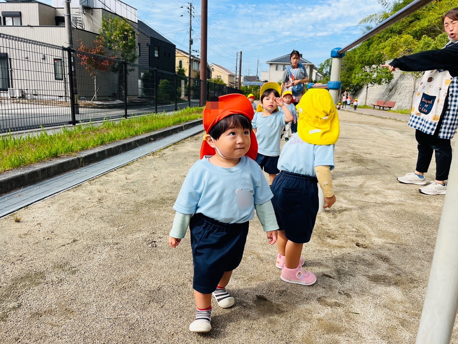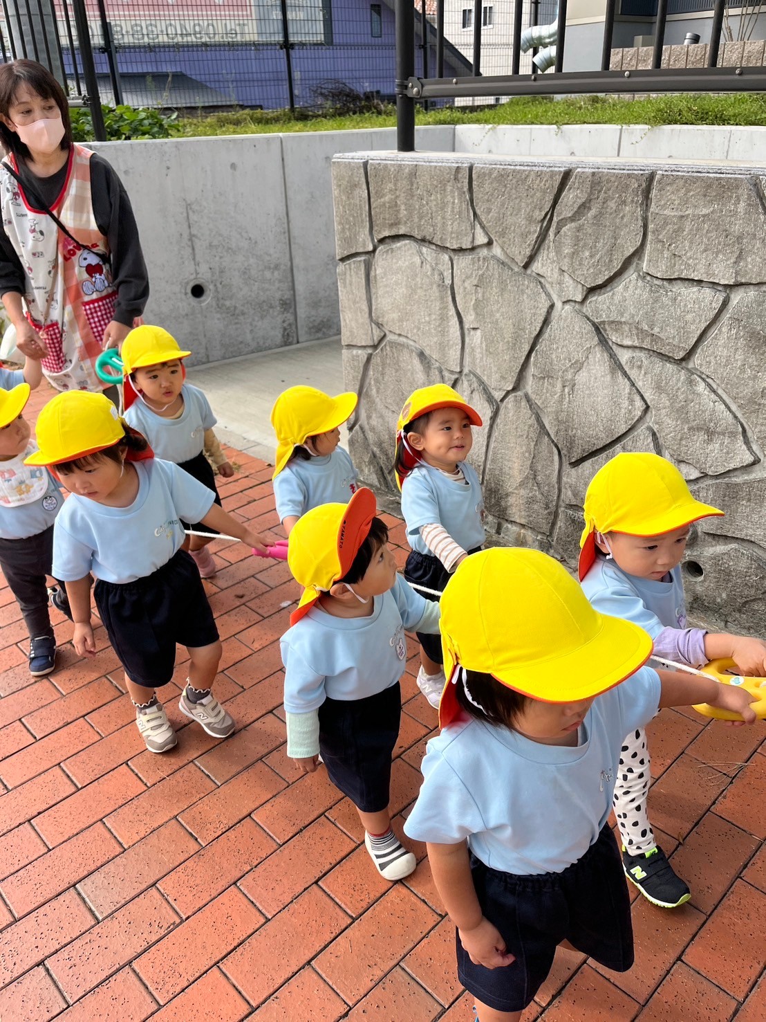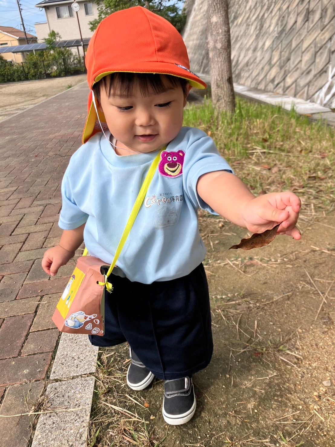 着いてからはお散歩バックを1人ひとり配り斜めにかけながら落ちてる落ち葉🍂やどんぐりを拾いましたよ🥰自分で入れたり出したりを楽しんだり、友達同士でふれあう姿が見られましたよ😊