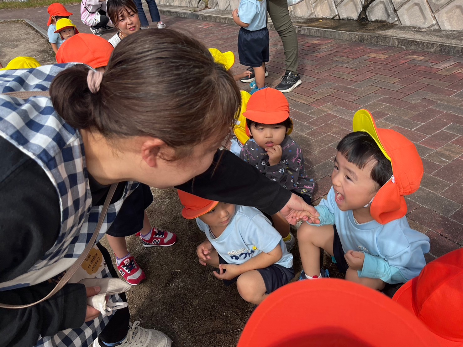 公園でカナプンを見つけ興味津々のお友だち❣️棒でつんつんしてみたり、触ってみたり😃カナブンが動くたびに「きゃー」と大騒ぎでした😄遊んでいると、不審な人が近づいてきて…先生と一緒にみんなで集まり避難しました。ちょっと緊張していましたが、「いかのおすし」などの先生のお話をしっかり聞いていました😊