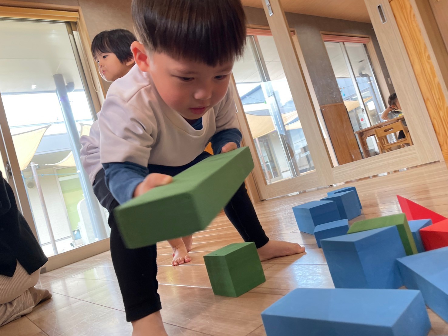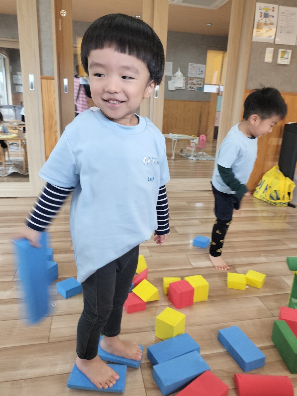 発表会の練習のあとはウレタンブロックとスポンジブロックで遊びました。高く積み上げたり長くつなげて電車🚃や車🚙を作って遊びました😄