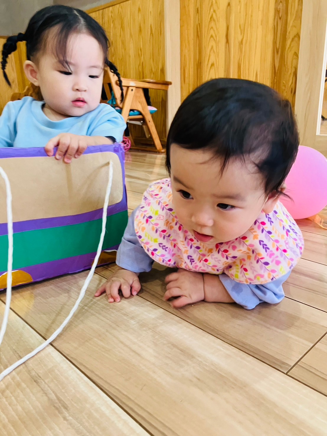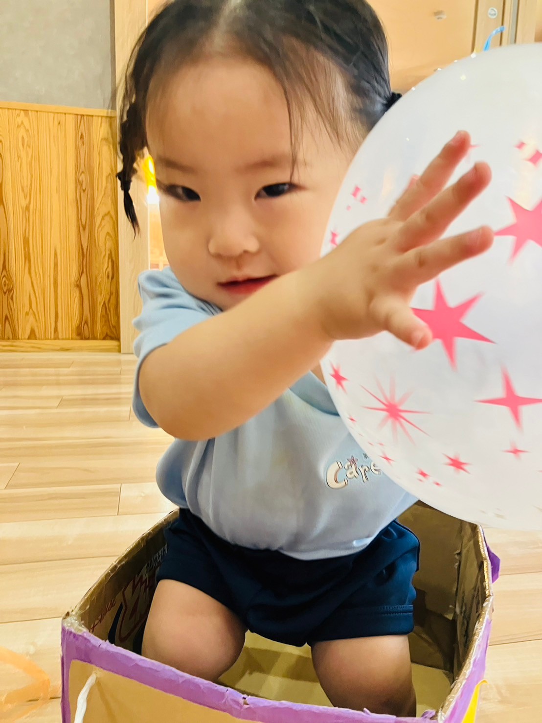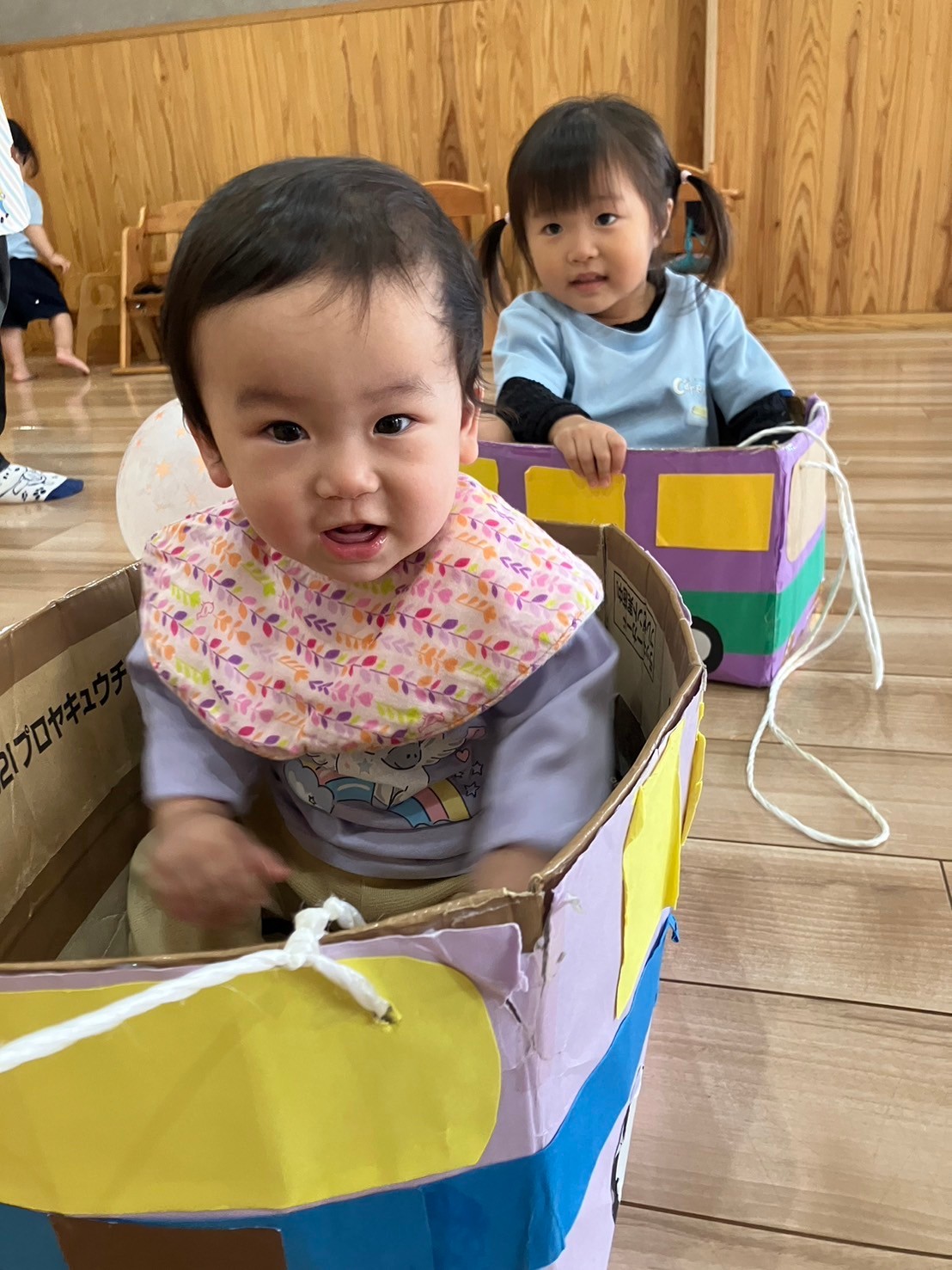その後、室内で風船🎈やダンボールバスに乗って遊びました☺️バスに乗って引っ張っていくと、嬉しそうに笑顔を見せていたひよこぐみさんでした🥰りす🐿