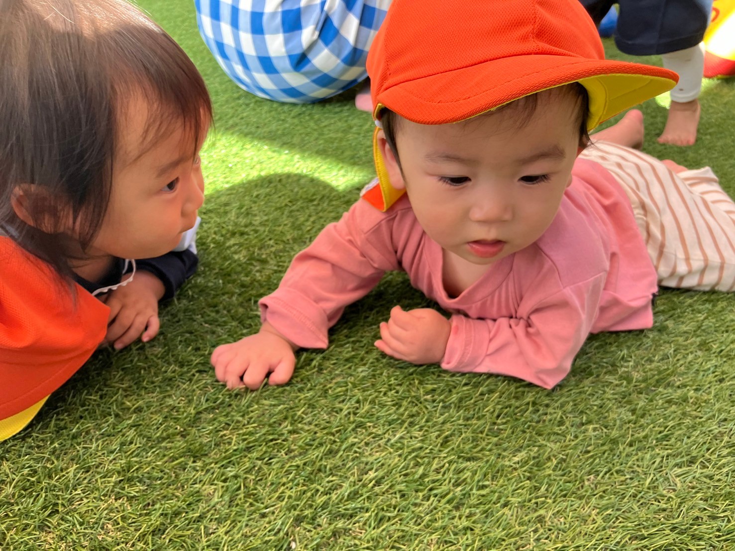 天気が良く気持ちのいい風が吹く中芝生にごろんと転がりころころーと上手に体を使って転がったり、大きな蜘蛛を見つけみんなに教える姿や「すごいー?😆」といいながらボールを投げてみたり頭に乗っけようとがんばるお友だちもいましたよ🤣園庭が大好きなりす組さんです🎶