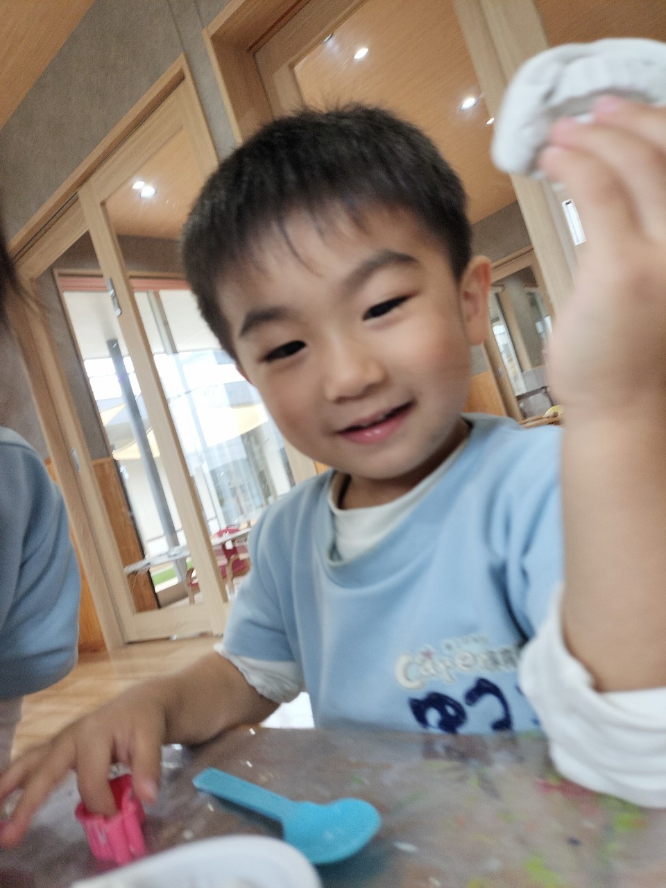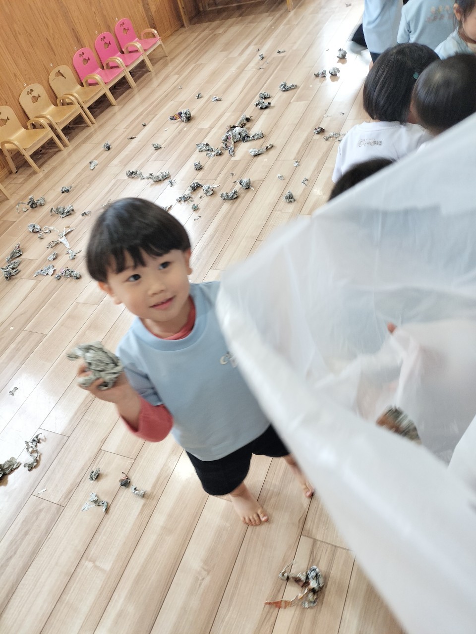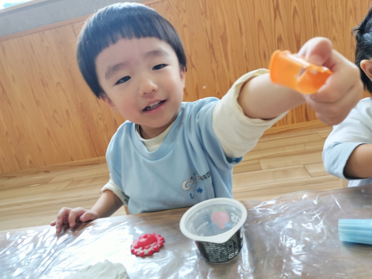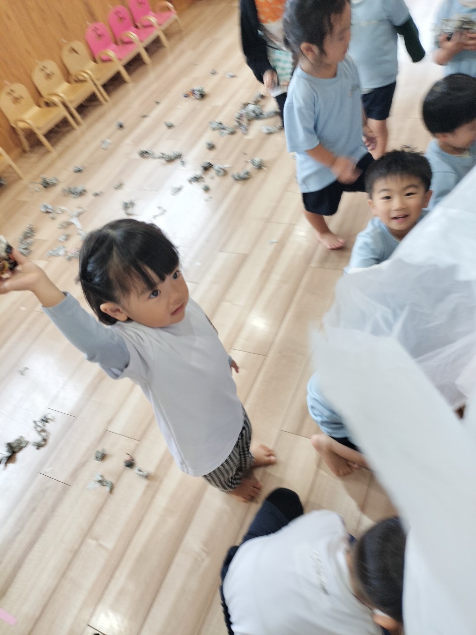 後半は雨☔️だったのでお部屋で新聞紙遊び、粘土遊びをしました。新聞紙を沢山ビリビリ破ってボールにして大きなビニール袋にいれて遊びんだり、途中ビニール袋に大きな穴を開けると落ちてくる新聞紙ボールに大興奮🤣 『もーなんでおちてくるのー😂』とみんなで話しながら楽しんでいたぱんだ🐼ぐみさんでした🩷粘土遊びも『団子🍡三兄弟』の歌♫に合わせてお団子を作ったり、型抜きでいろいろな物を作って楽しく遊ぶ事ができました✨くりえいと園