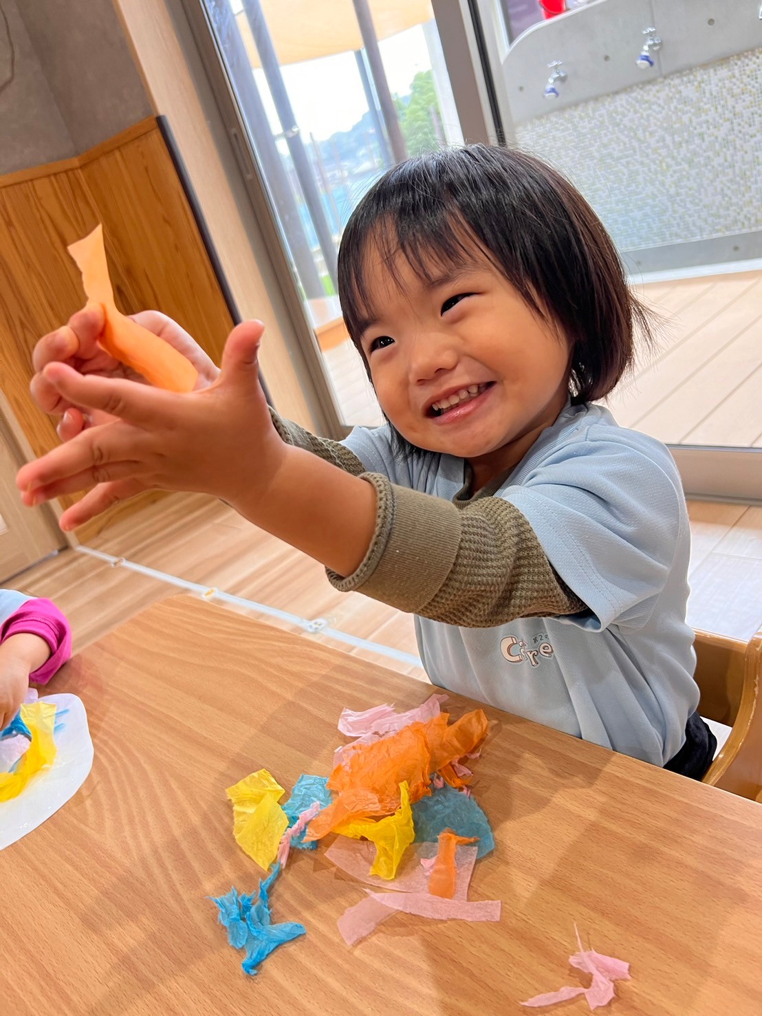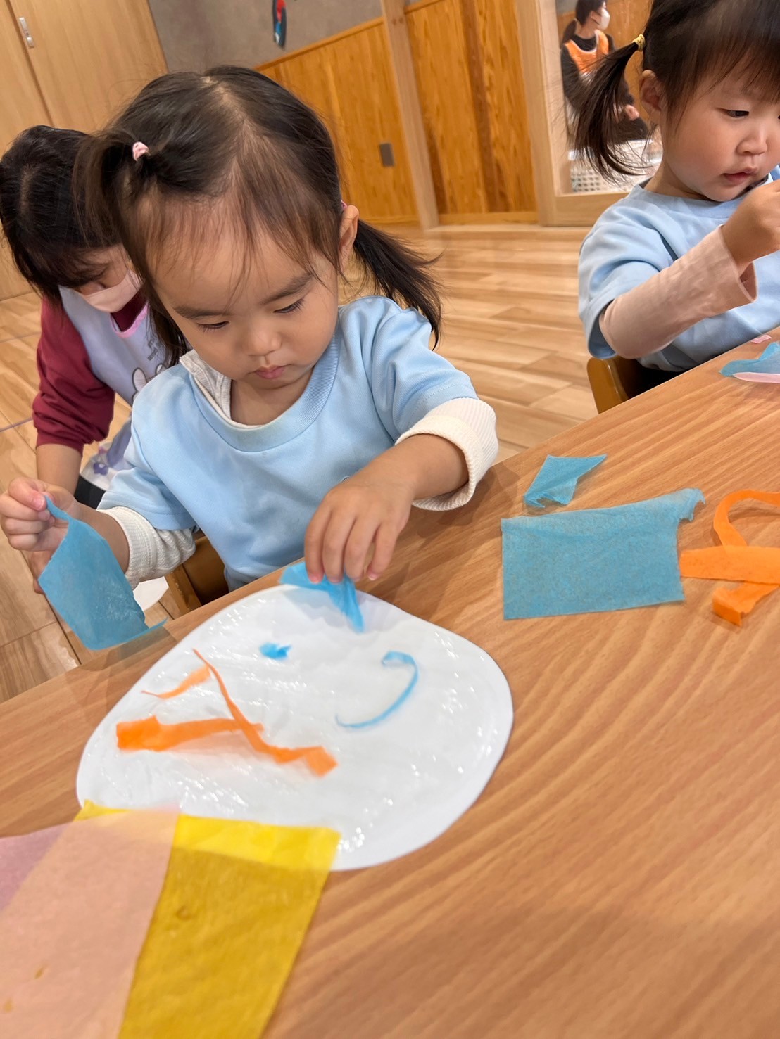 いろんな色の花紙を手でちぎってペタペタ貼っていきました😌✨