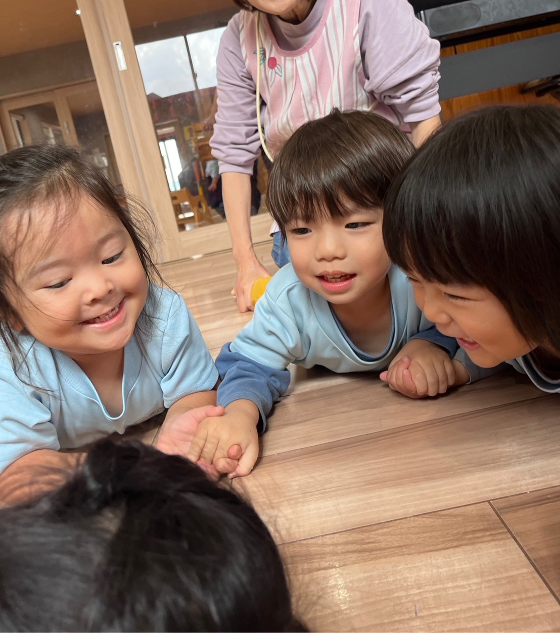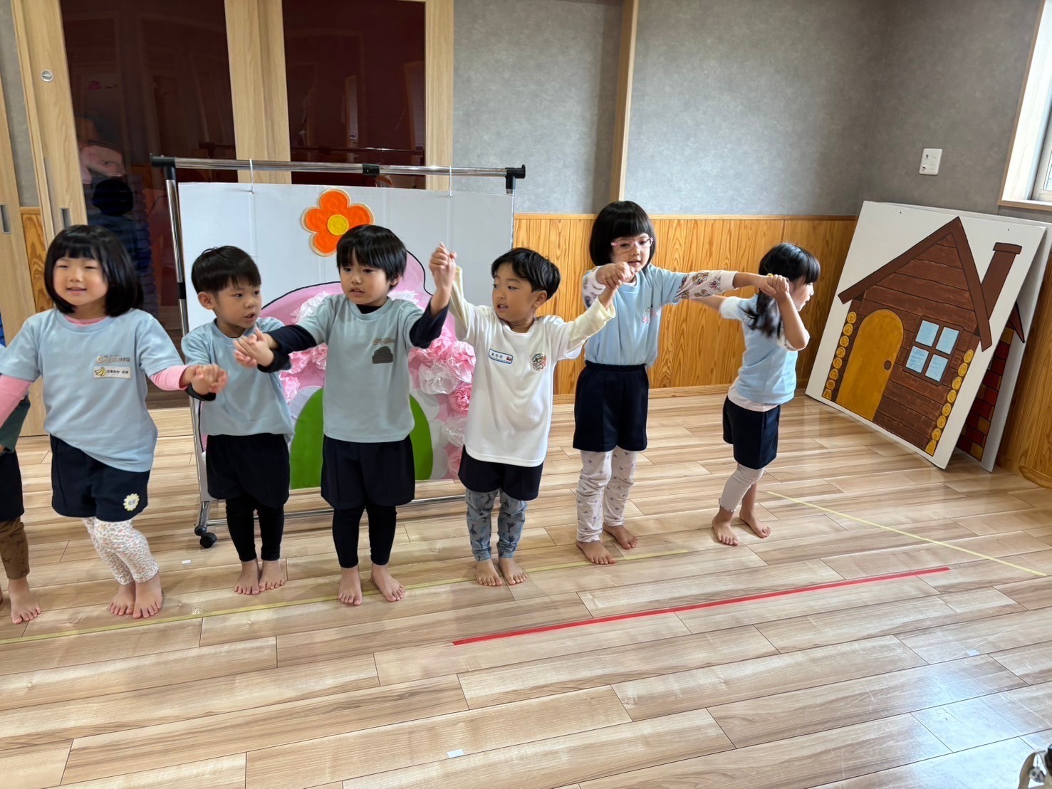 その後発表会の手遊びとダンスの練習をして、保育者をよく見て踊ることができていました🥴👍外が寒かったのでお部屋の中で引っ張り遊びをしました🎶みんなで手を繋いで保育者が1人ずつ足を引っ張って行くのを耐えていました🌟男の子たちは引っ張られるのが楽しかったようで簡単に手を離していましたが、女の子たちはルールをしっかり理解して最後まで引っ張られずに残っていました👏🏻✨寒くなってくるので室内でもできるゲームを考えていきたいと思います🥹うさぎ、こあら、きりん組