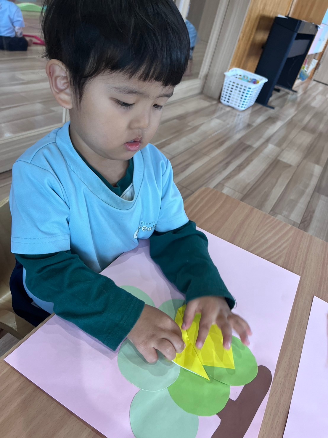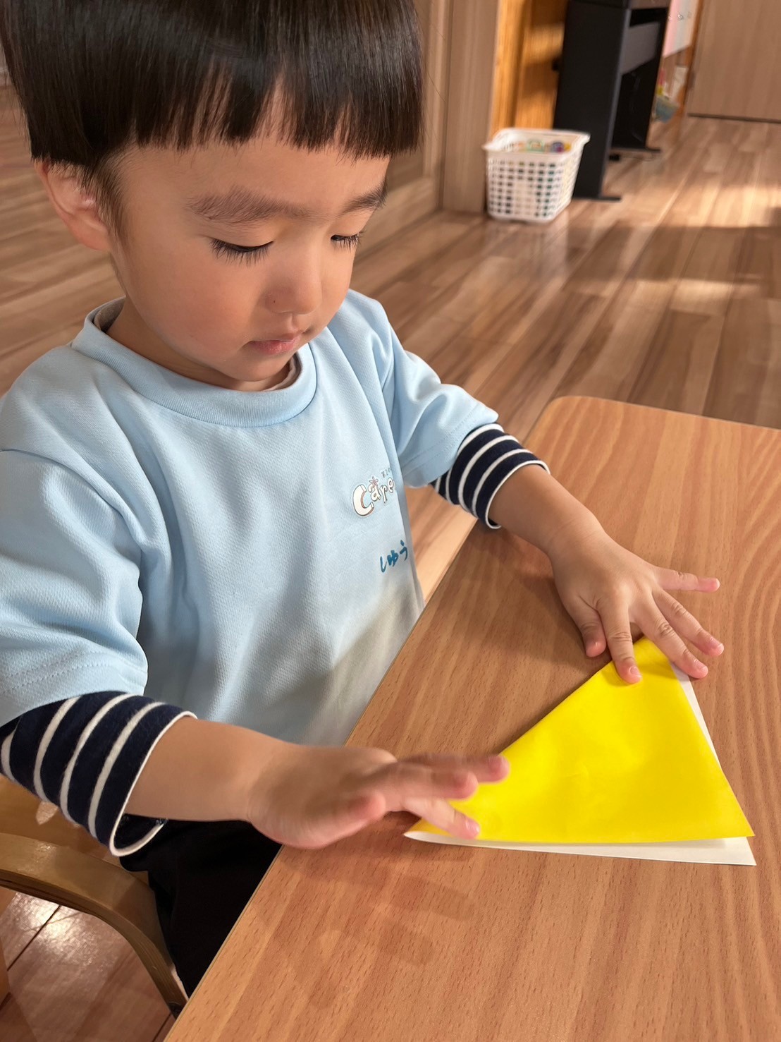 今日は月製作でキツネを折りました🦊保育者と一緒に折りすすめ、指先を使い「アイロンシュシュシュ〜」と折り目をしっかりつけることができました🥰三角の折り紙を見て「手裏剣みたい」と違う形に想像して保育者に話す子もいました🤩🎶
