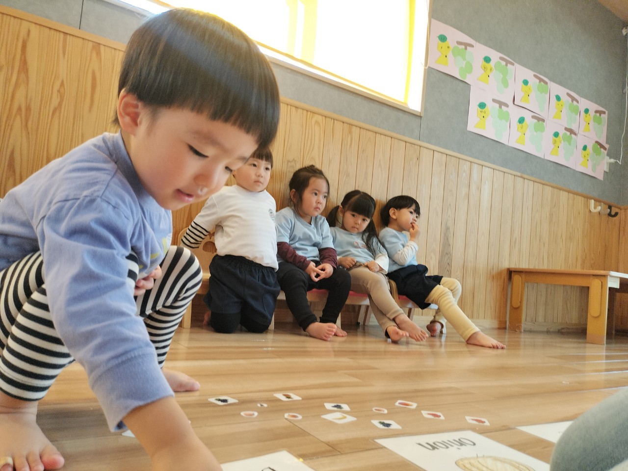 今日は最初に英語教室がありました🔤。発表会で歌う英語の🎶歌の練習をしましたよ。その後、『I Like 〜』のお勉強をしました😊 たくさんある食べ物の絵から好きな食べ物を選んで同じ絵のカードの上に置いていきました。色んな食べ物があり、悩んでいたぱんだ🐼ぐみさんでしたが上手に『I like〜🍓🍊🍇』と答えることができました😆(拍手)