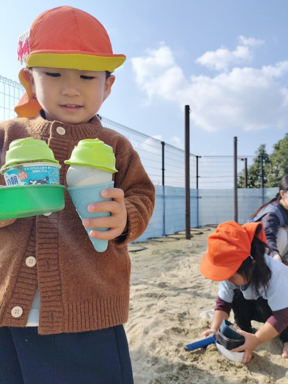 英語教室の後は園庭でたくさん遊びました。お店やさんごっこをしたりひよこ組さんやりす組さんにカップなどを貸してあげて一緒に楽しく遊びましたよ❤️うさぎ、こあら、きりん組