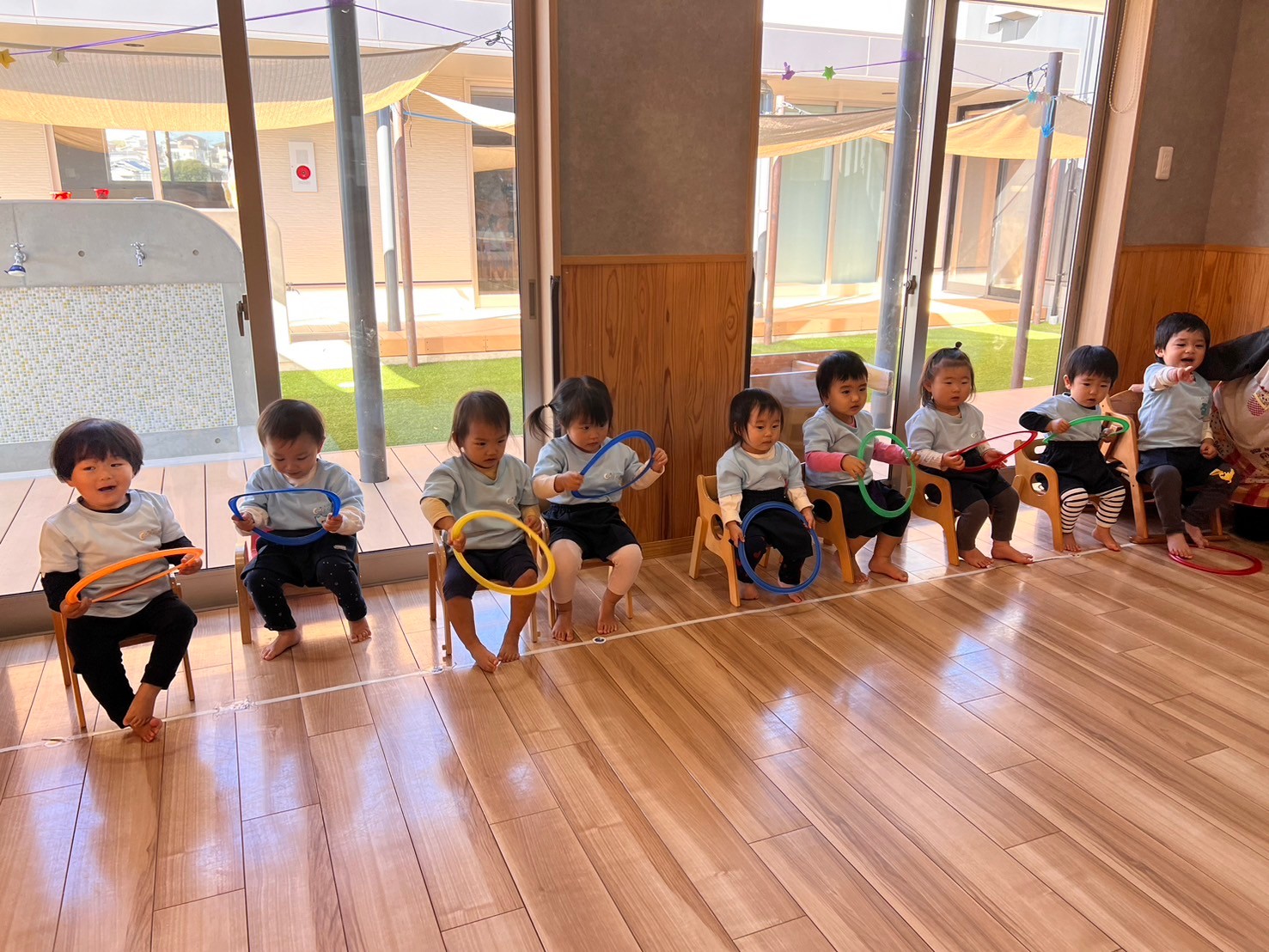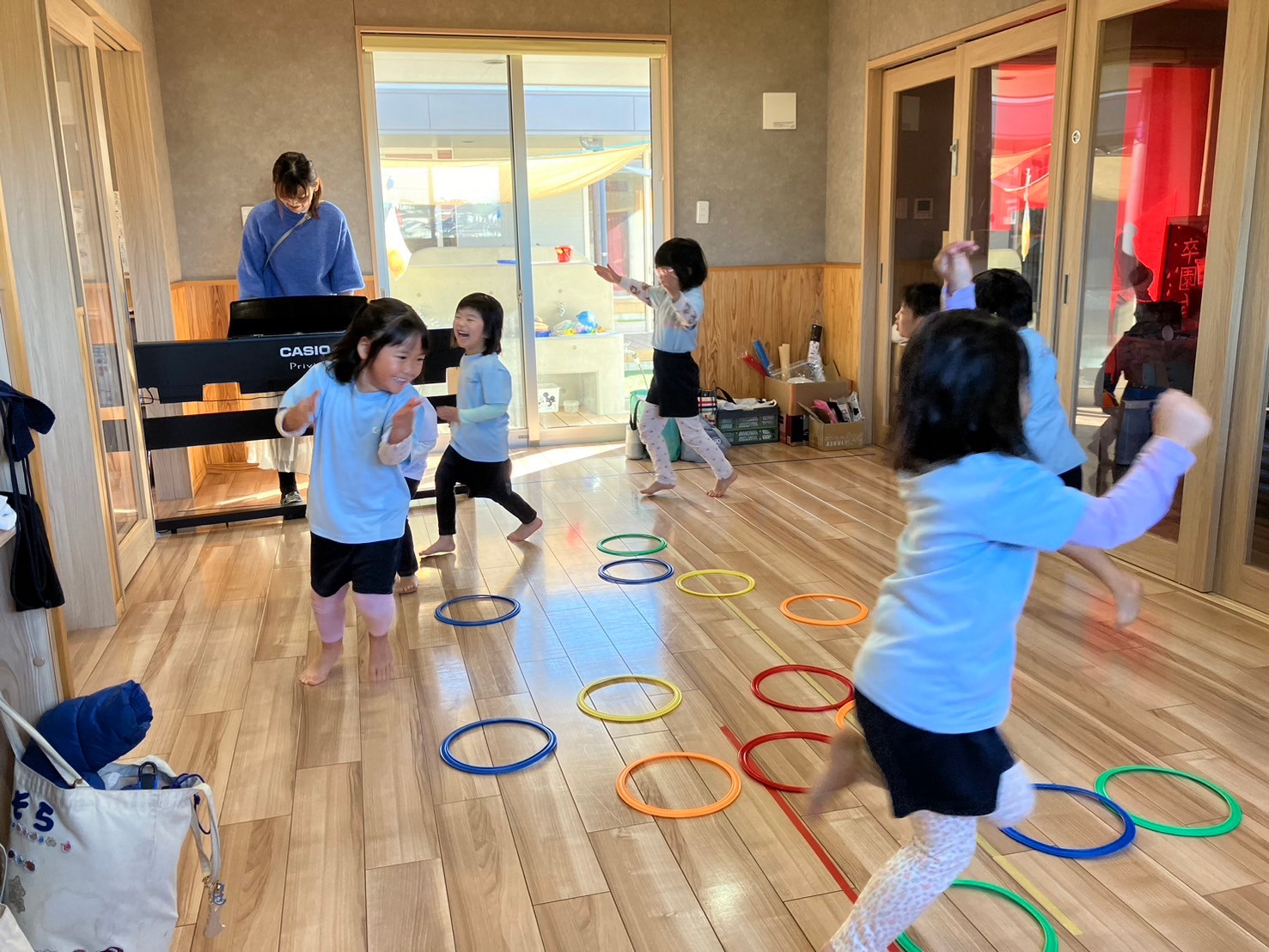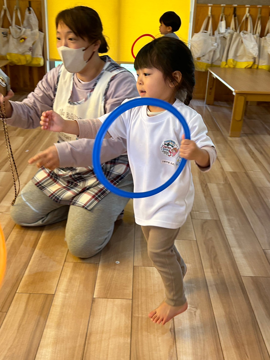 リトミックでは、まゆみ先生のお話をしっかり聞き、真似っこしながら身体を使って音楽を楽しんでいましたよ✨