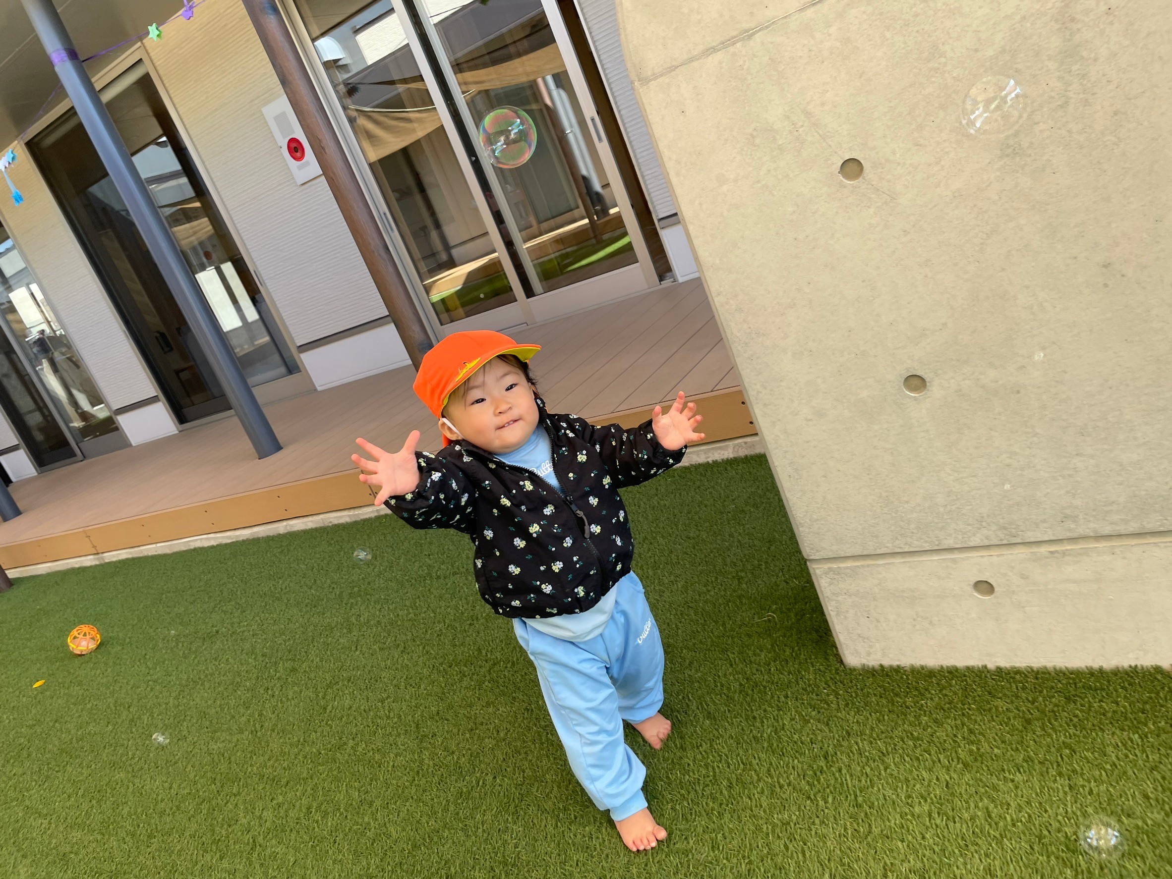その後は園庭に出て、シャボン玉やボールを追いかけたり、園庭に置いてあるおもちゃや落ち葉に興味を示したりと、それぞれ楽しんでいましたよ❤️