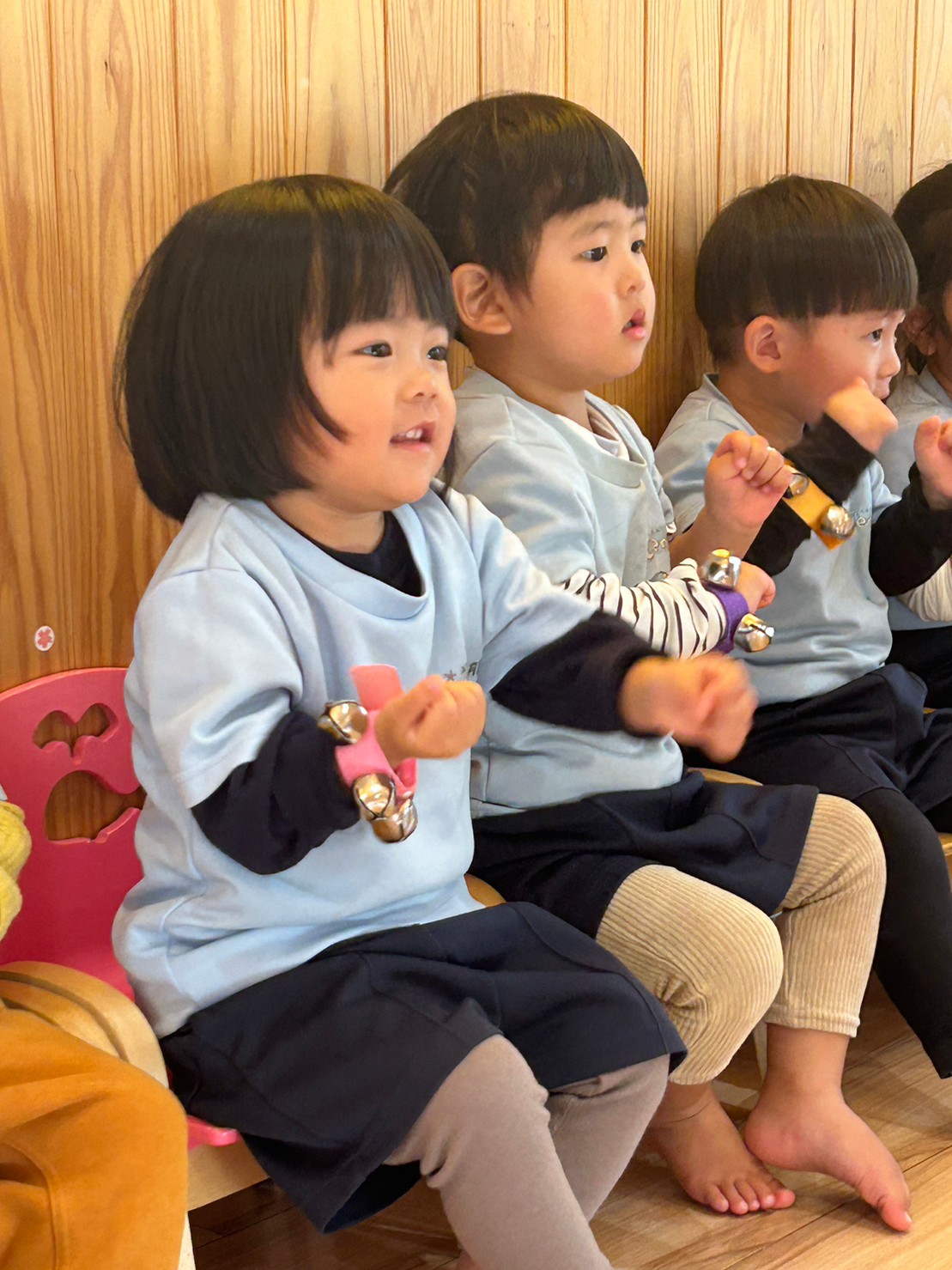 「おはながわらった」の歌に合わせてカラフルスカーフをヒラヒラ揺らしたり、丸めてお花の形を作ったり、鈴でクリスマスソングを演奏しました🔔💕ずっとニコニコで楽しんでいましたよ😌🩷
