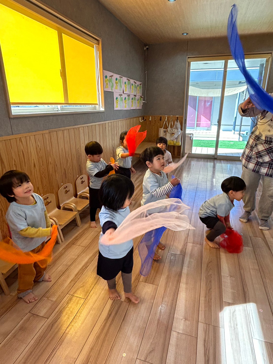 スカーフを使って表現遊びを楽しんだり、フープを使って即時反応を楽しみましたよ☺️その後はお散歩へ行きました❣️
