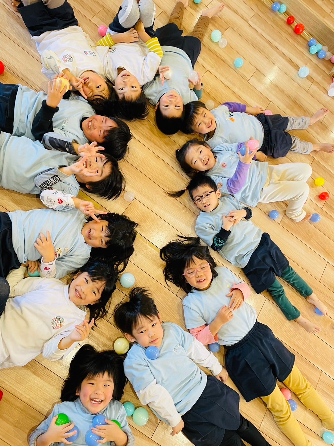 部屋中にあるたくさんのカラーボールをみんなで集めて、その集めたボールをザザーーー!!っとかけると