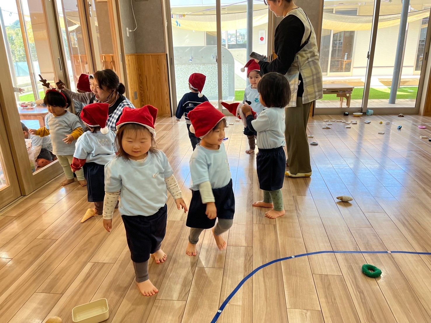 皆でサンタさんになろう!と皆でサンタ帽を被りミニサンタさんになってクリスマスソングに合わせてダンスをしました🎅ミニサンタさんがたくさんの、少し早めのクリスマスパーティーを楽しんだ子どもたちでした✨ぱんだ組🐼