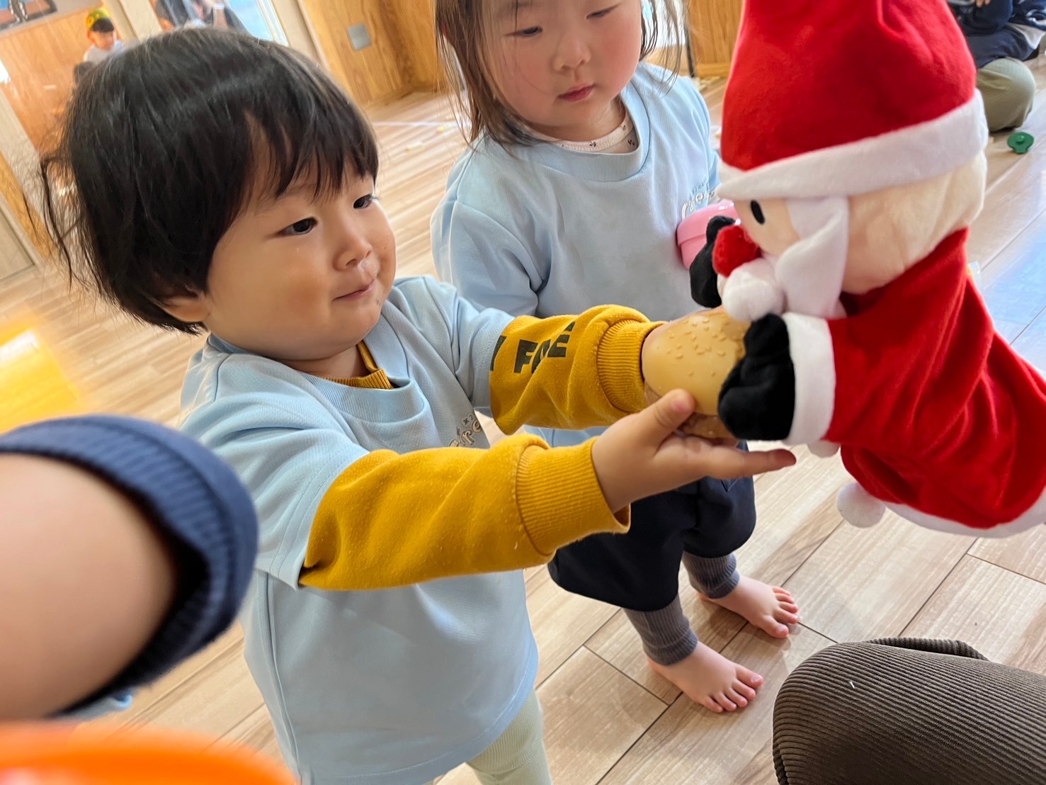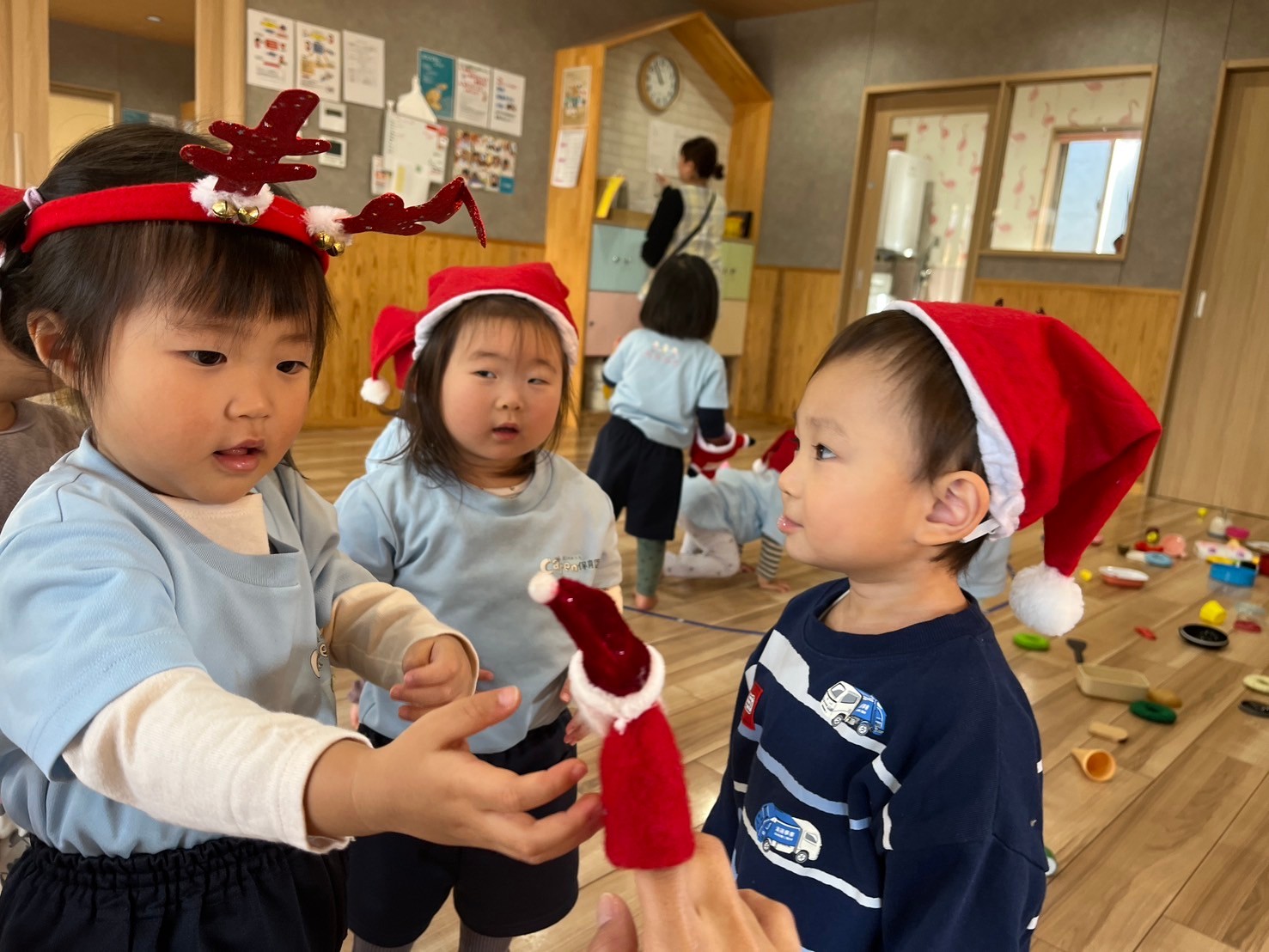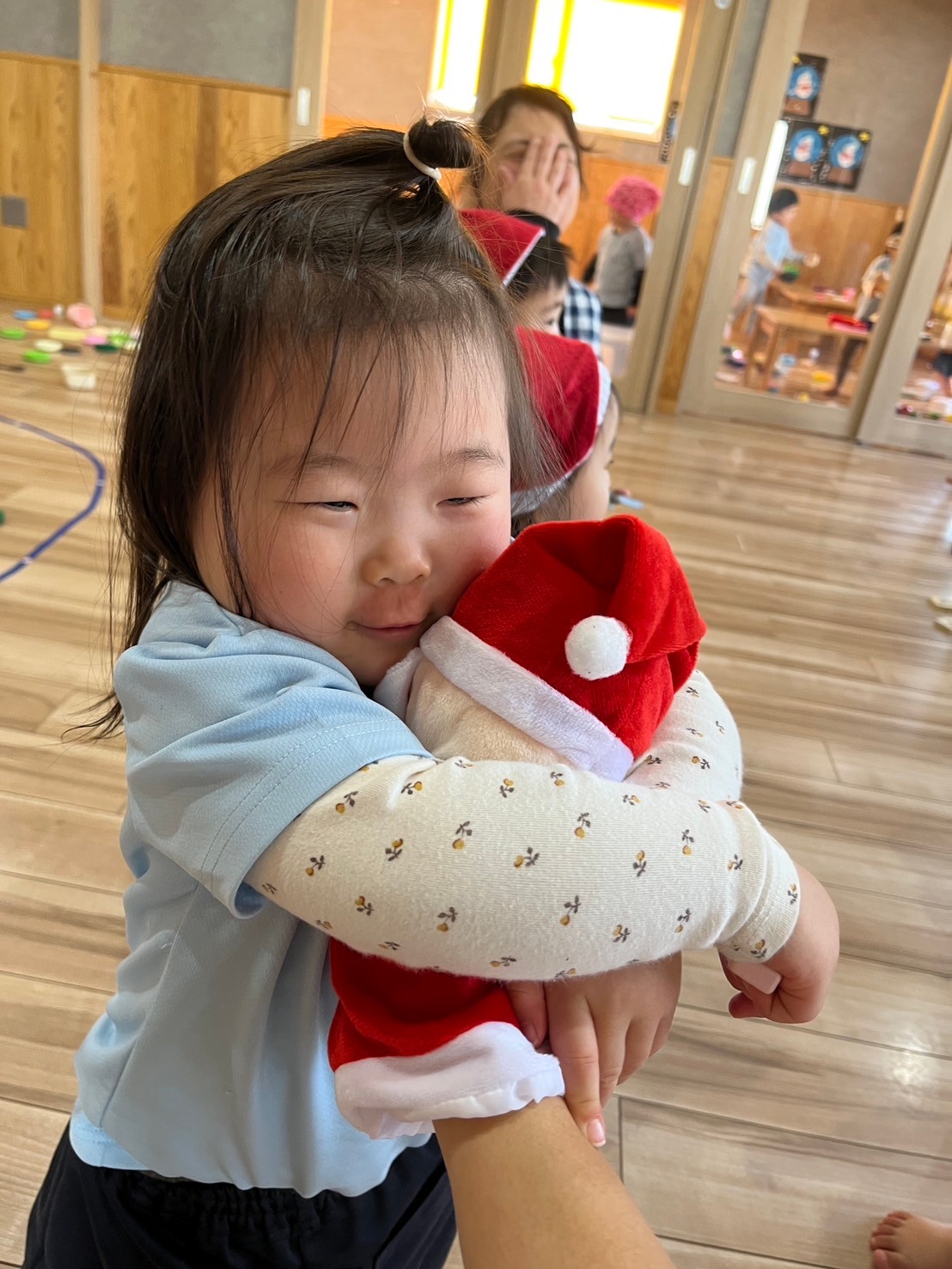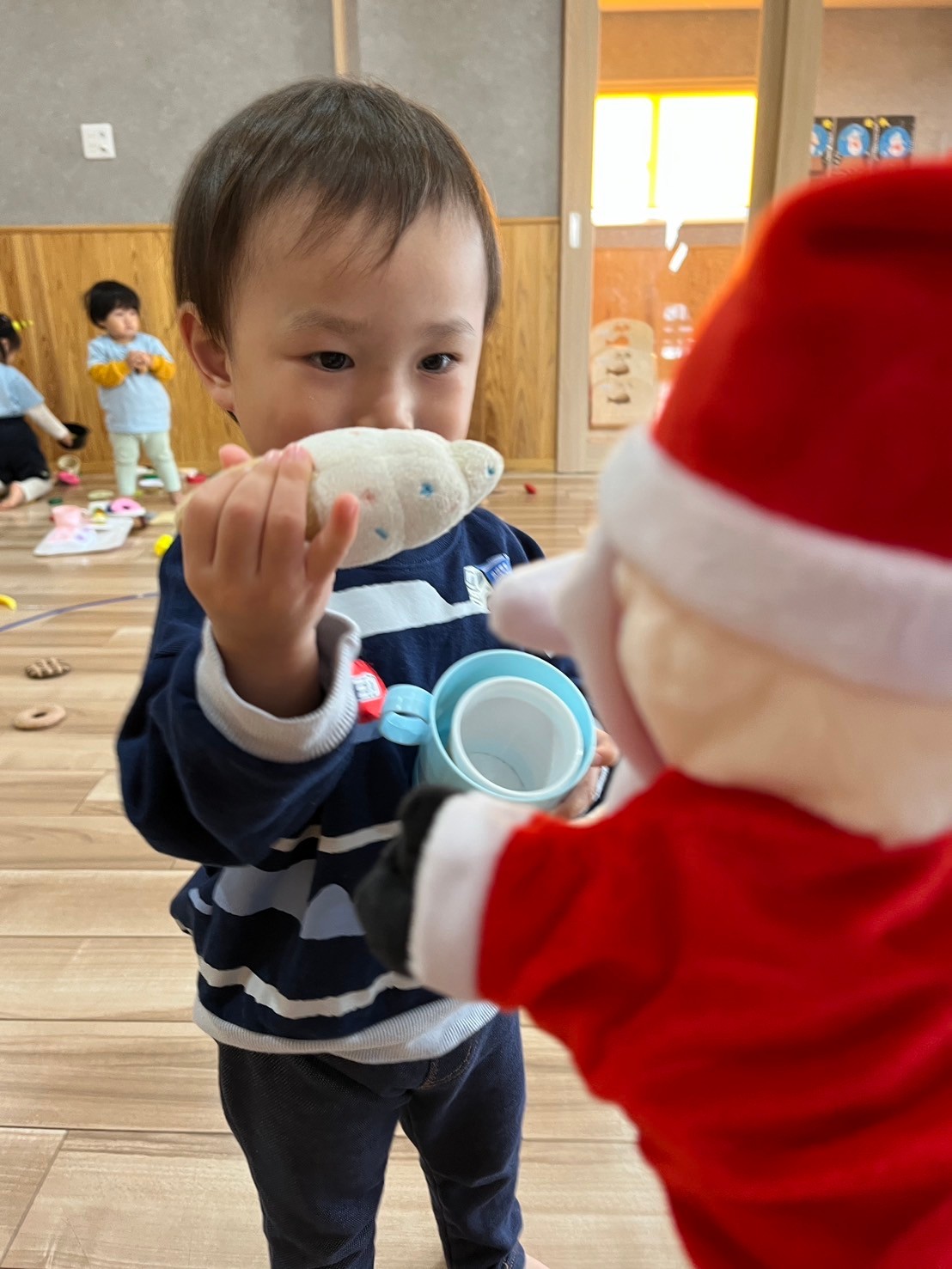 途中パペットのサンタさんが登場するとクリスマス気分も高まっていた子どもたちは、「サンタさんぎゅー」「サンタさんどうぞー」と抱っこしたりお世話したり🤭
