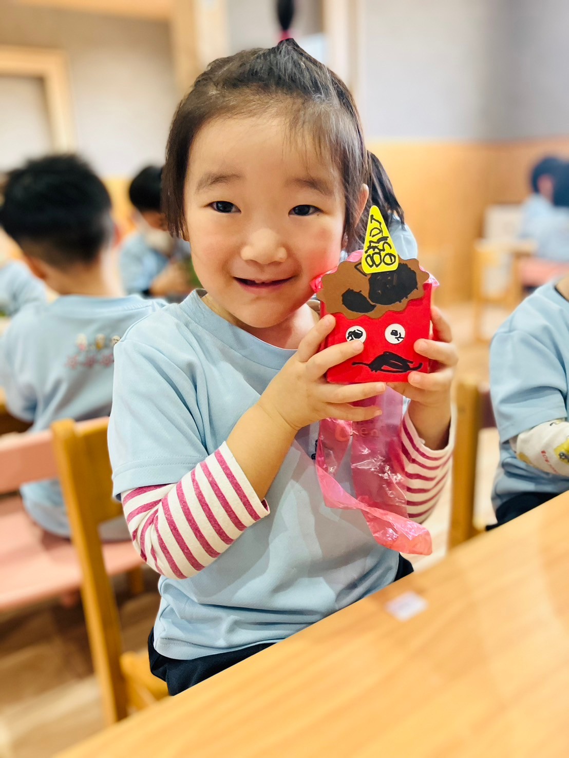 鬼の髪の毛やツノ、目をのりで貼り、口を描いて可愛い鬼さんのマスが出来上がりました✨