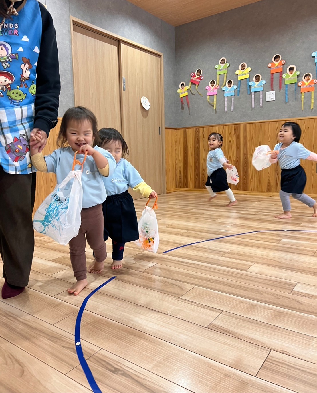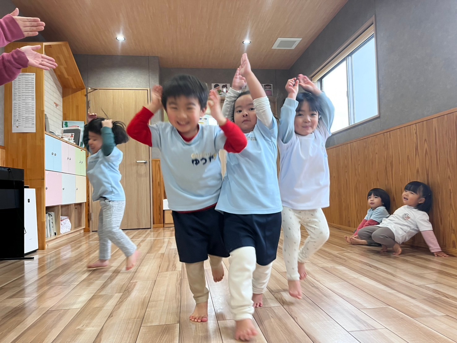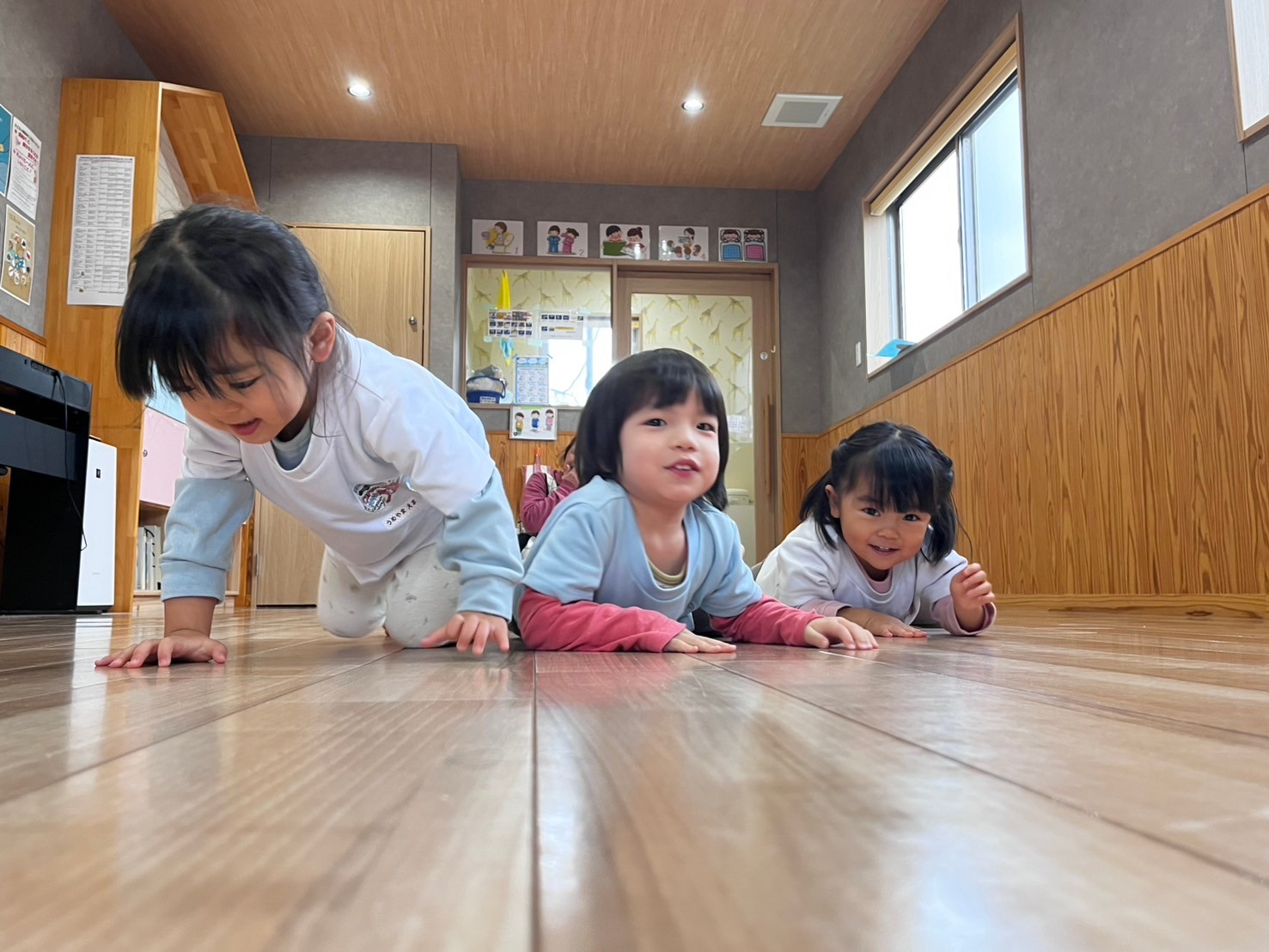 その後は運動遊びをしました🤸‍♂️ハイハイレースやアヒル歩きなど身体全身を使った遊びを取り入れて、最後にうさぎ跳びをしていたら、両足跳びがいつの間にか2ステップになって“阿波踊り“のようになってしまい、保育者で笑ってしまいました🤣💗