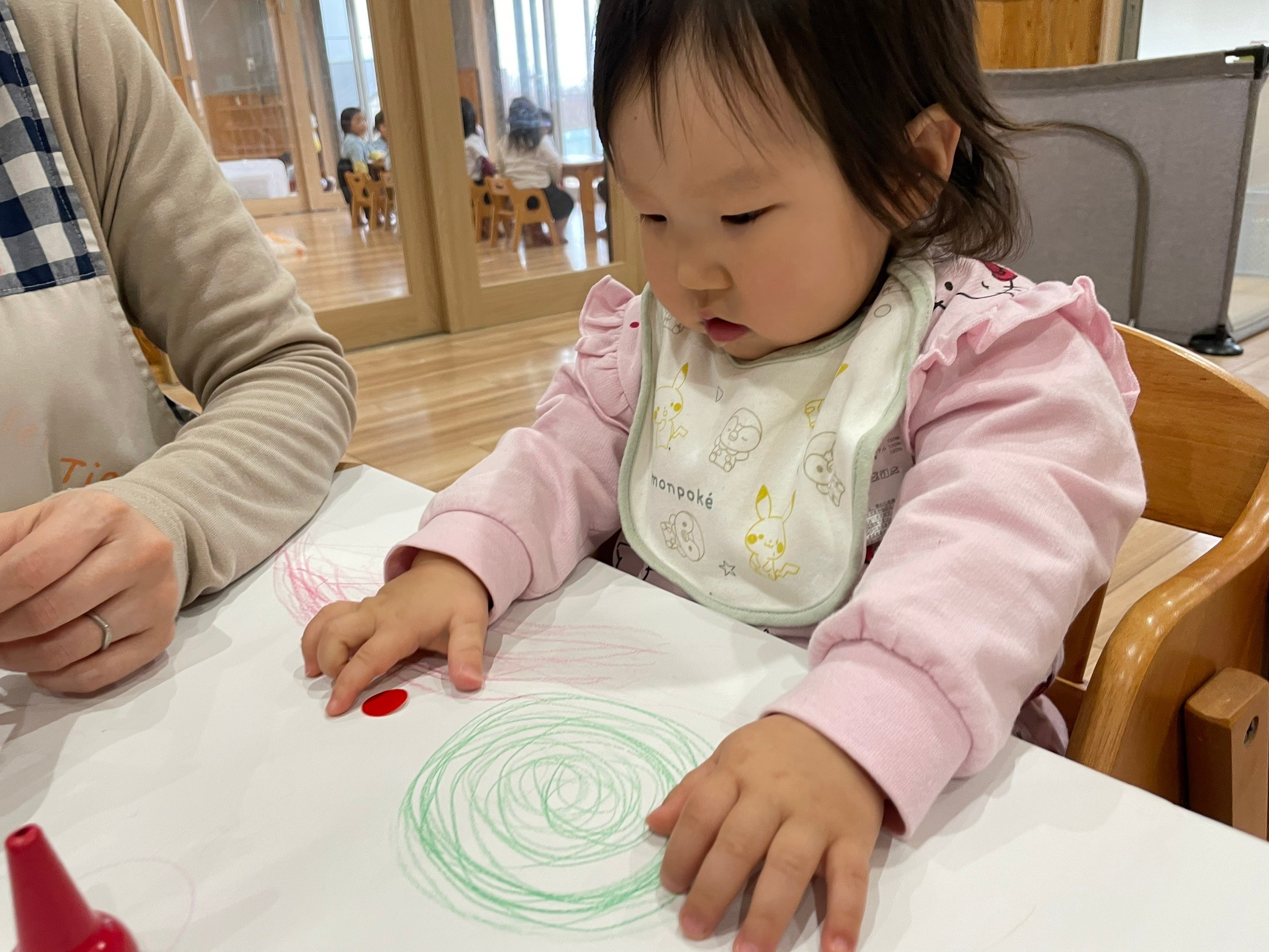 まずは好きな色のクレヨンを自分で選び、真っ白な模造紙に色を描いていきましたよ✨