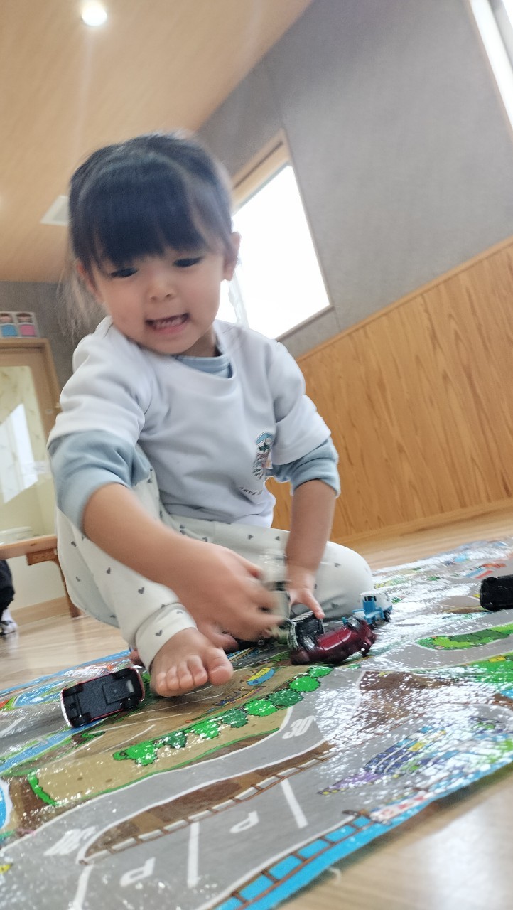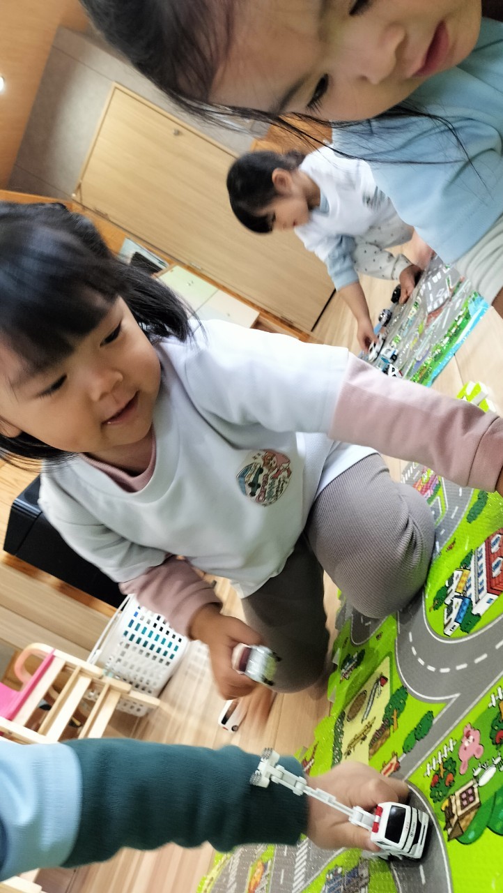 今日も室内でトミカで遊びました🚗新しい道路や車が増えて遊び方が個人で遊ぶのではなく複数人で遊ぶ姿が見られました☺️💕救急車は怪我した人を乗せる車🚑、パトカーは悪い人を捕まえる車🚓など、理解してごっこ遊びを楽しんでいました🥰