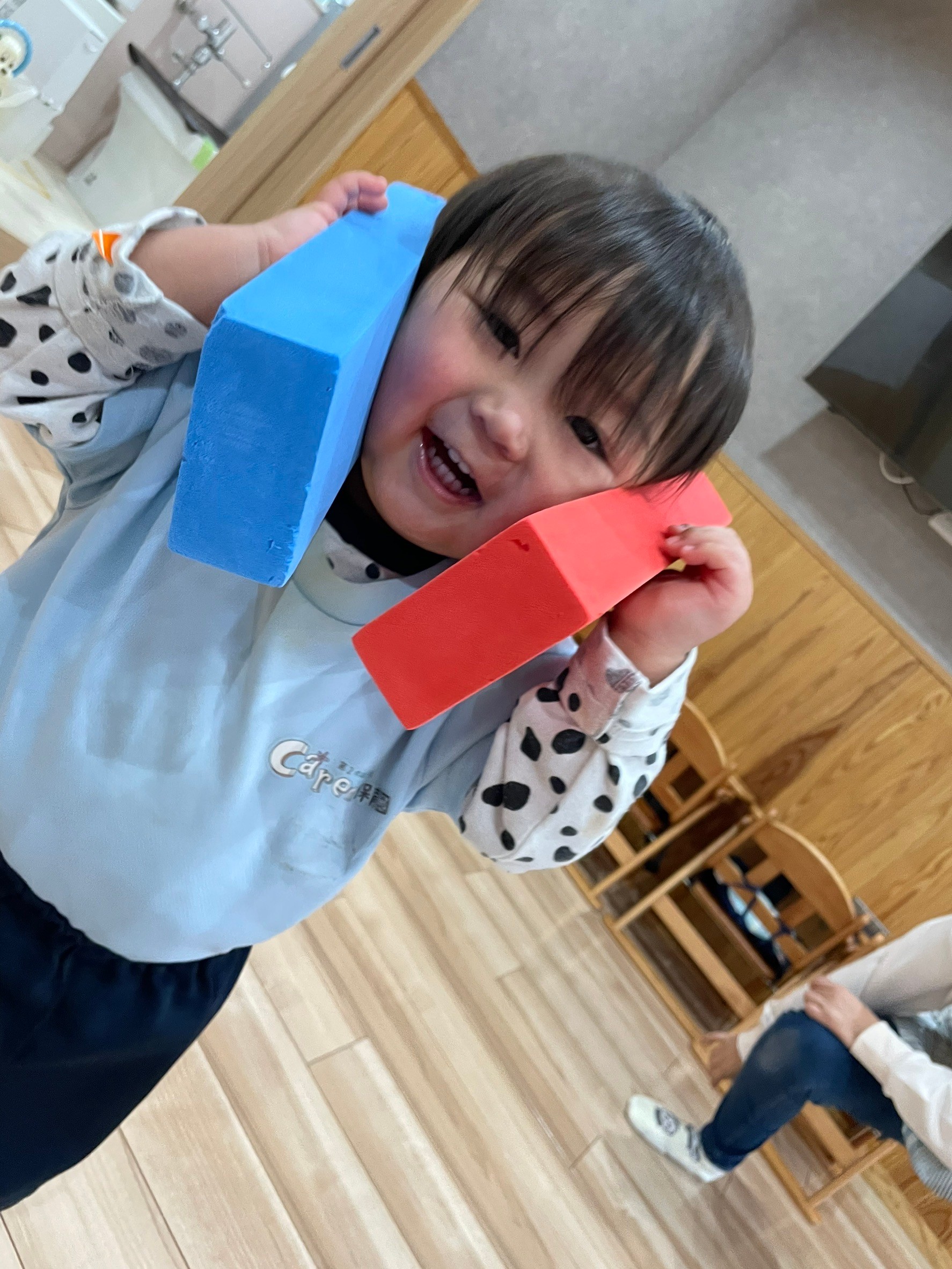 積み木同士を叩いて音を出したり、転がしてみたりと、目の前にある物をどう使うかを考えて遊ぶ姿も見られました😍