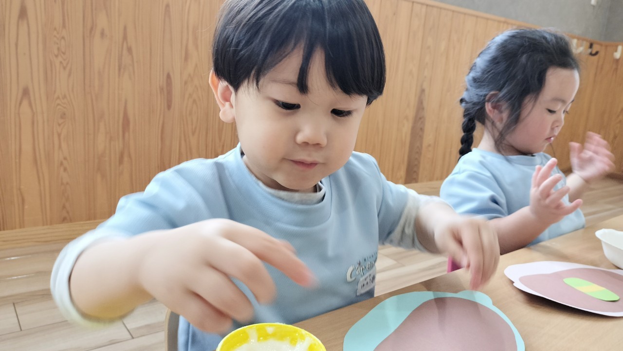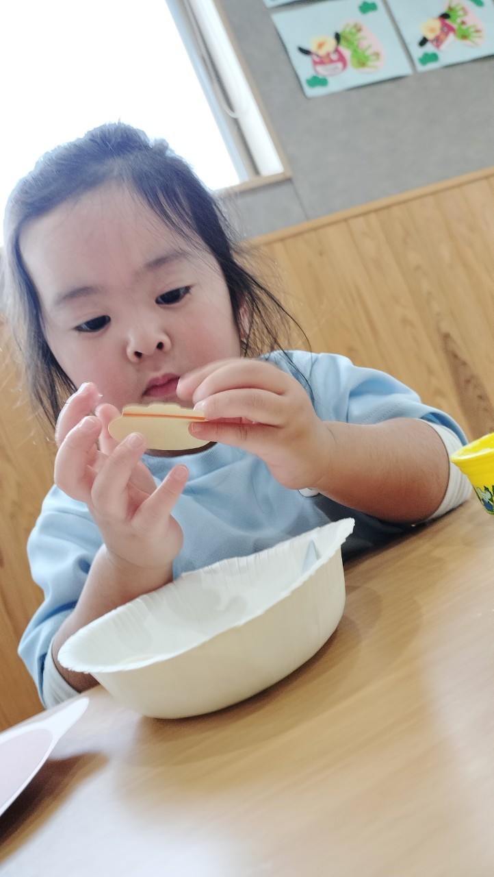 今日は最初に英語教室がありました🔤。お天気☀☁や『Hello』をしてから動物🦍🦒の名前の勉強をしていきました。一生懸命に覚えようとする姿が見られましたよ😊。英語教室の後は糊製作でおでん作りをしました🍢。具材の名前を教えていき、大根の筋とこんにゃくの模様をクレヨンで描いてからそれぞれのパーツに糊をつけてお鍋に貼っていき美味しそうなおでん🍢ができましたよ😋糊の使い方は上手に出来ていました👏。 最後はお正月遊びの凧ずくりをしました。ビニール袋にシールを貼っていき、紐をつけてもらったあとに園庭で走りなが凧揚げを楽しむことが出来たぱんだ🐼組さんでした。うさぎ、こあら、きりん組