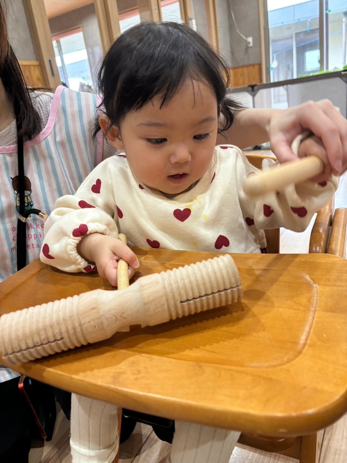 ひよこぐみ🐣今日はリズム遊びから始めていきましたよ🎶リトミックスカーフ🧣をリズムに合わせて上下、左右に動かしたり投げたりして嬉しそうに使っていましたよ💕友だち同士で被せあったり、繋げたスカーフをみんなで持って一緒にする楽しさを感じていたひよこぐみさんでした🥰そして、楽器遊びも一緒にしていきました🤗タンバリンやギロ、鈴🛎️トライアングル、マラカス🪇を鳴らし、見本を見て鳴らし方も上手に真似していましたよ✨パンダ組さんが🐼外で凧揚げしていたので揚げてる姿を見たり、パンダ組さんのお部屋をかりて気分転換を楽しみました💕