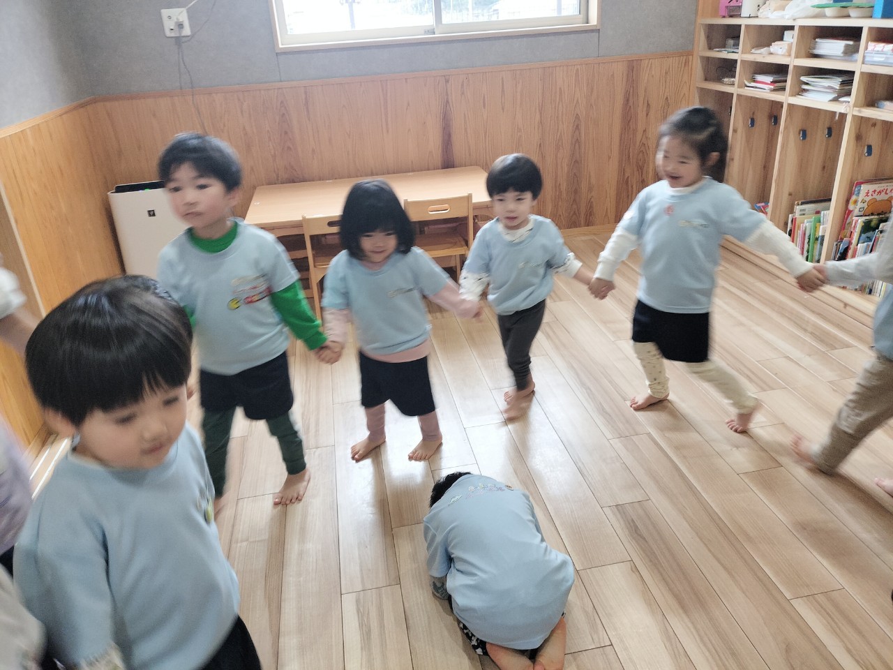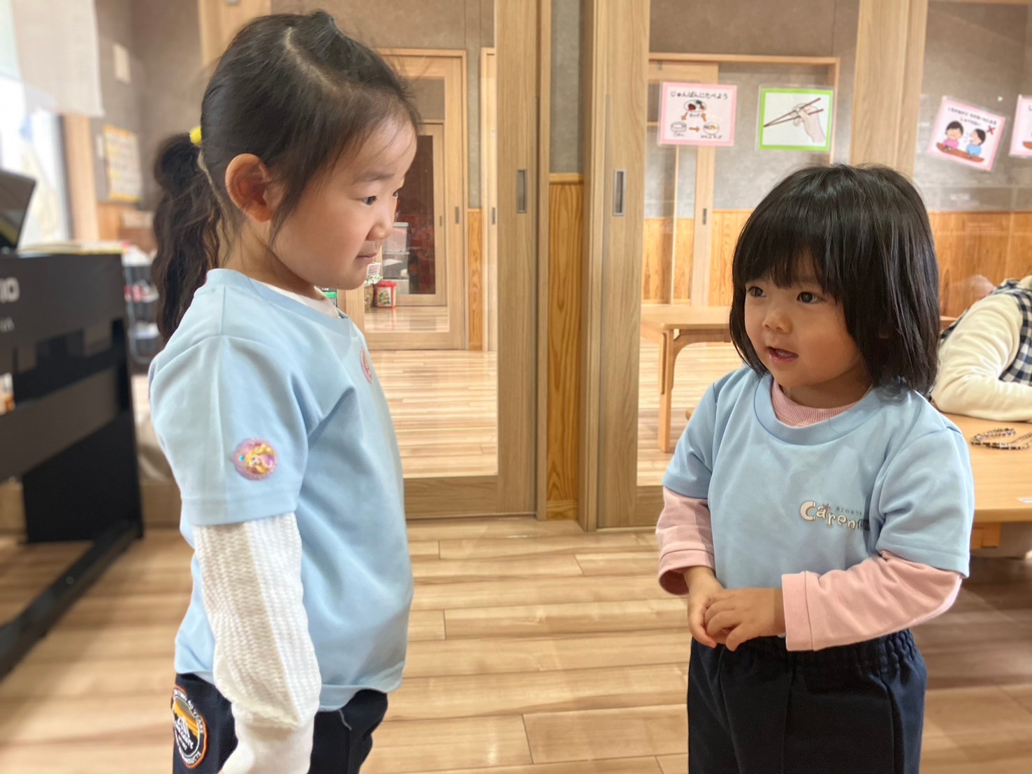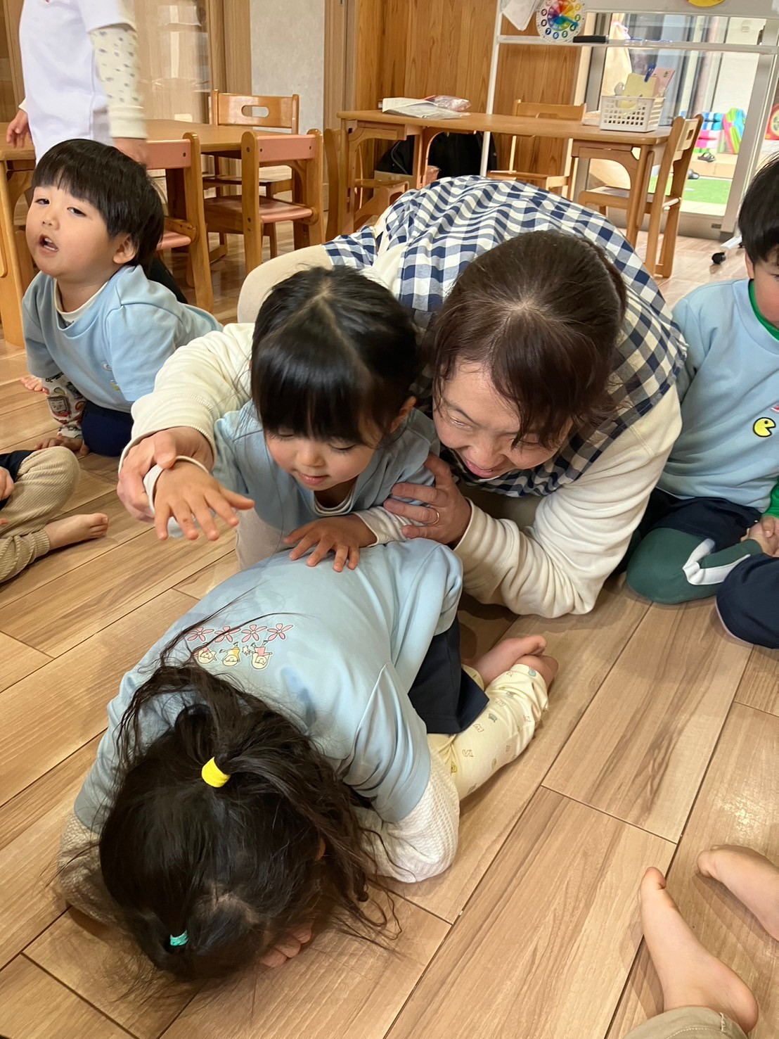 その後ぱんだ組さんが遊びに来てくれて、うさぎ組さんと自己紹介タイムをして、かごめかごめで遊びました❣️