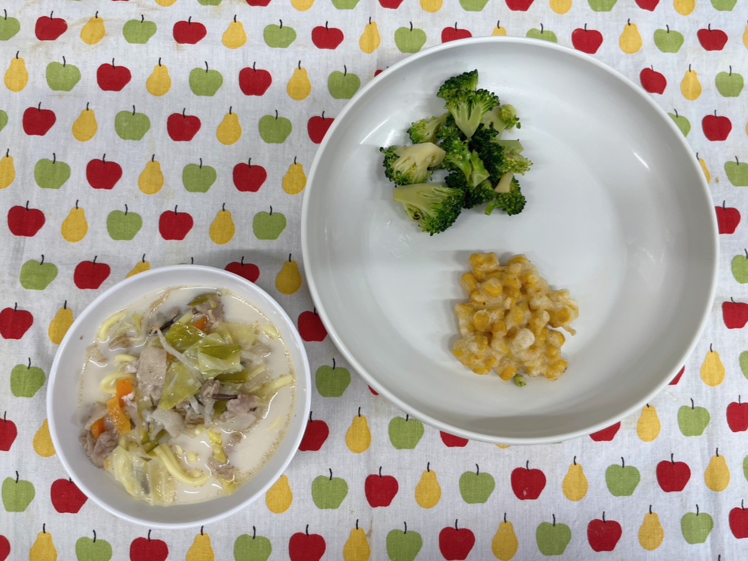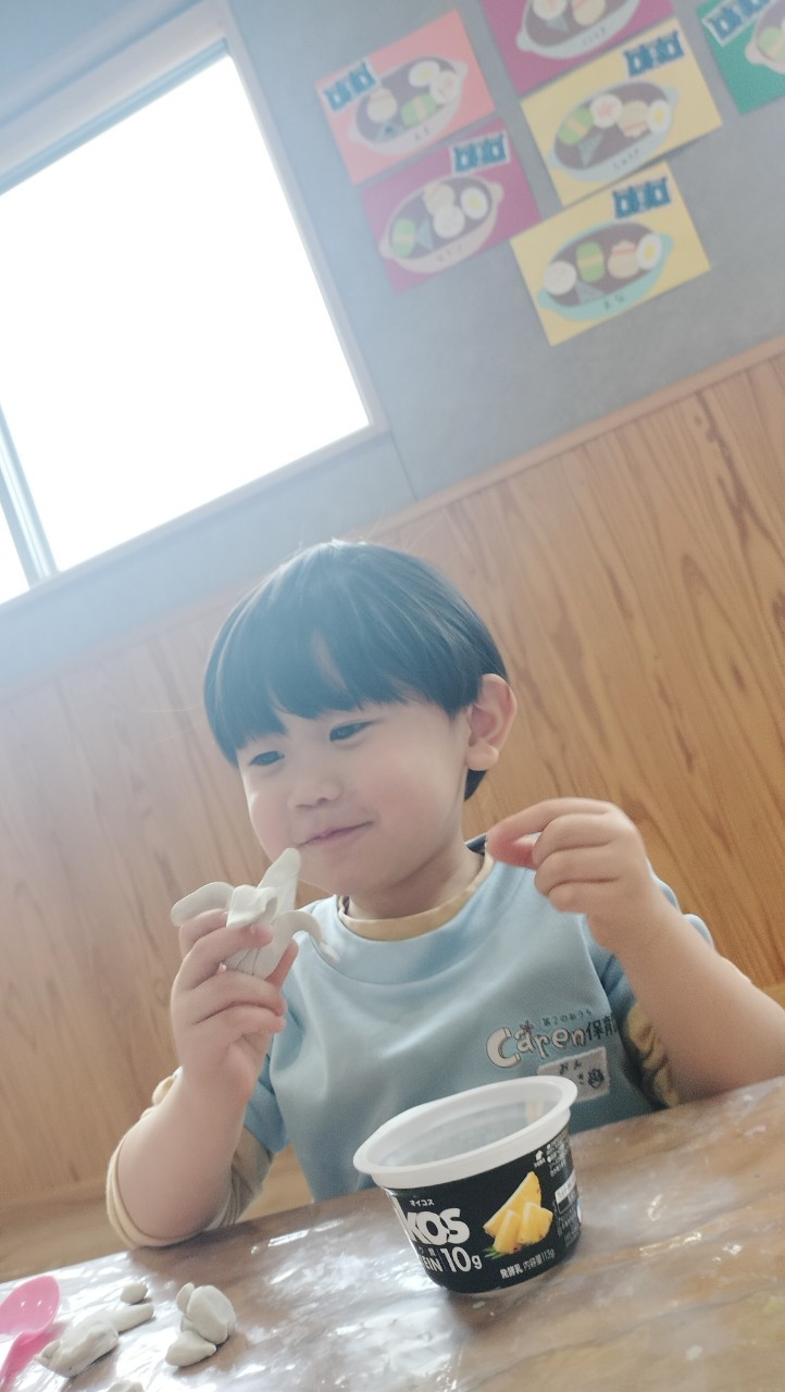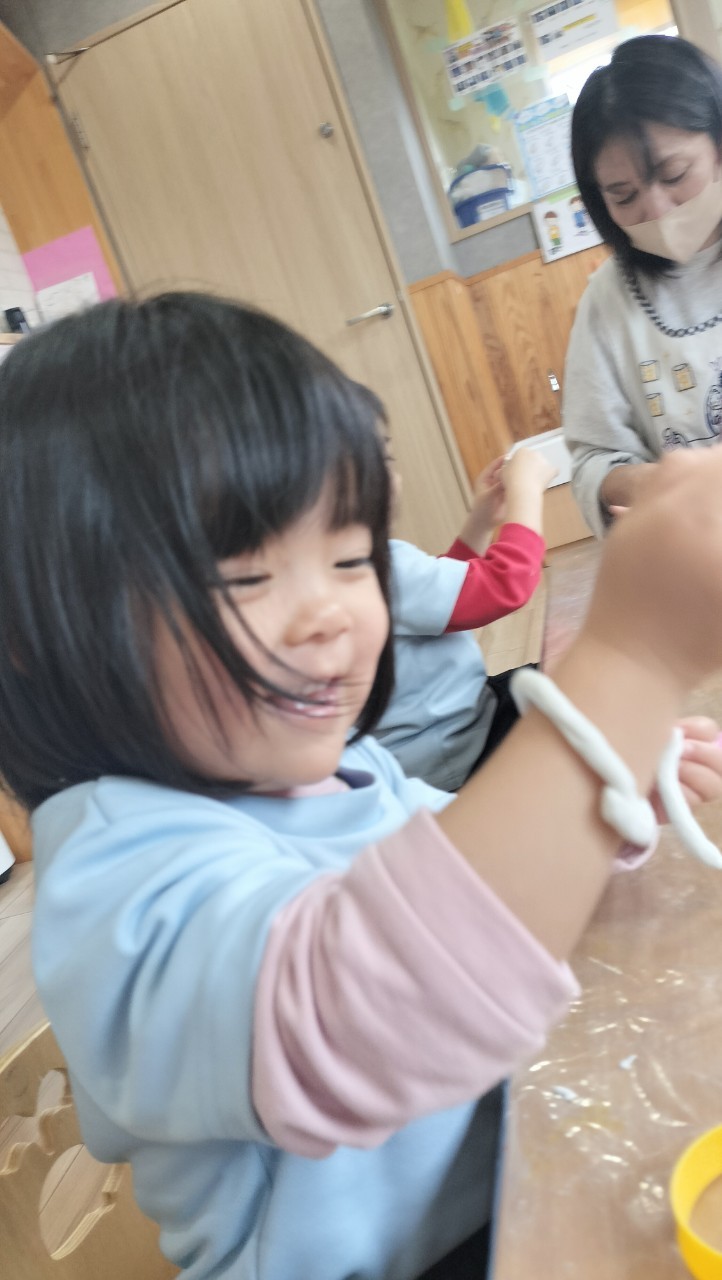 今日は最初に久しぶりに粘土遊びをしました☺️ 久しぶりの粘土遊びに釘付けなぱんだぐみさん✨、飛行機✈️や車🚗やハート♥の型抜きをすると壊れないように並べる子や飛行機🛫を飛ばして遊ぶお友達もいました😊 また先生と一緒にドーナツ🍩やソフトクリーム(ソフトクリーム)やバナナ(バナナ)を作ったりして楽しく粘土遊びができましたよ👍粘土遊びのあとは以上児さんのお部屋に行って過ごしました。自己紹介をしたり上手に名前や好きな食べ物を伝えることが出来たぱんだ🐼ぐみさん。最後は『かごめかごめ』をし、みんなで手を繋いぎながらふれあい遊び