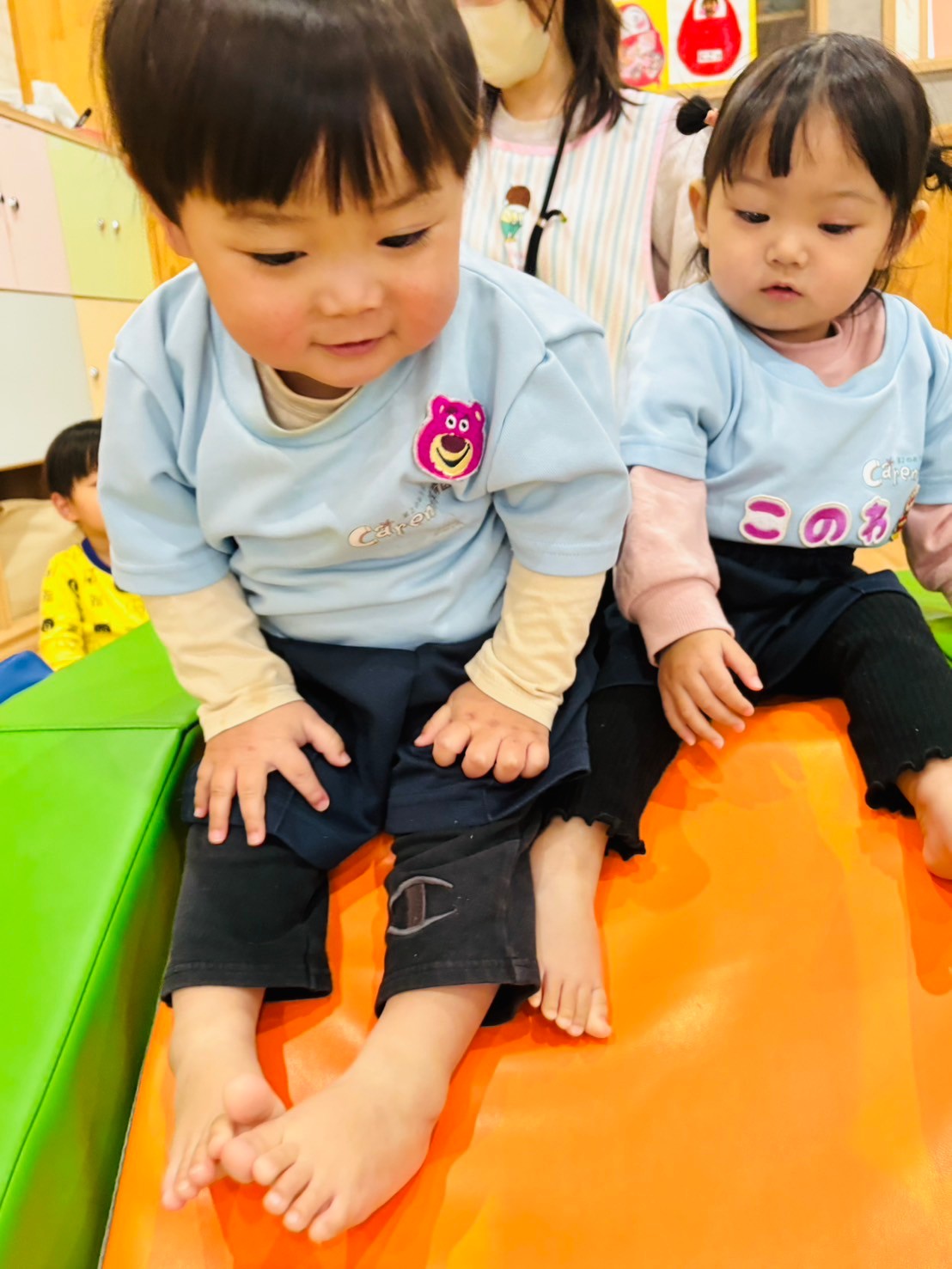平均台に座ってひとまず休憩☕️色んな遊びをお友だち同士で楽しめるようになってきたひよこぐみさんです☺️💕りす🐿