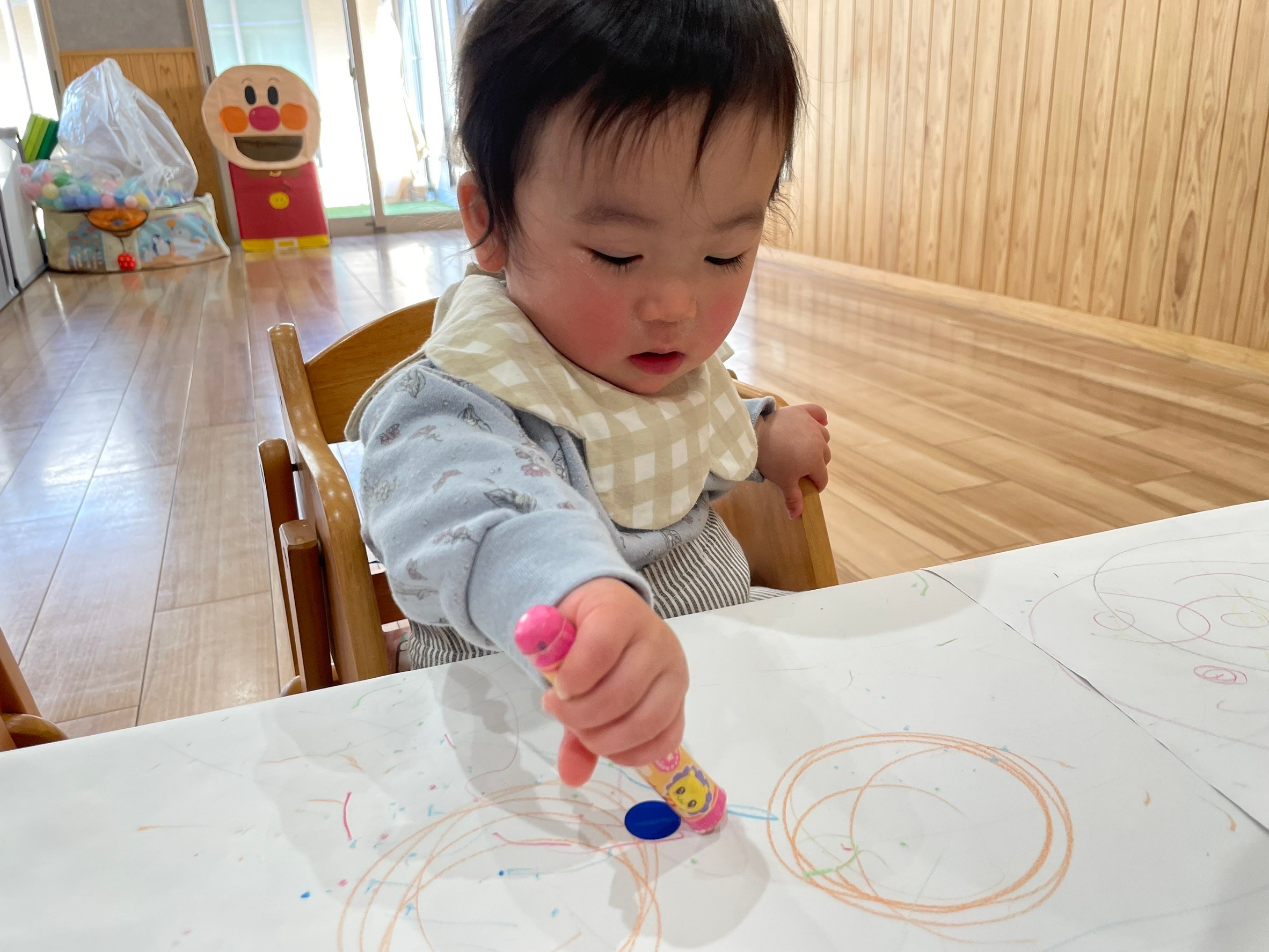 先生にアンパンマンやお花を描いてもらい、指差しする姿も見られました🥰