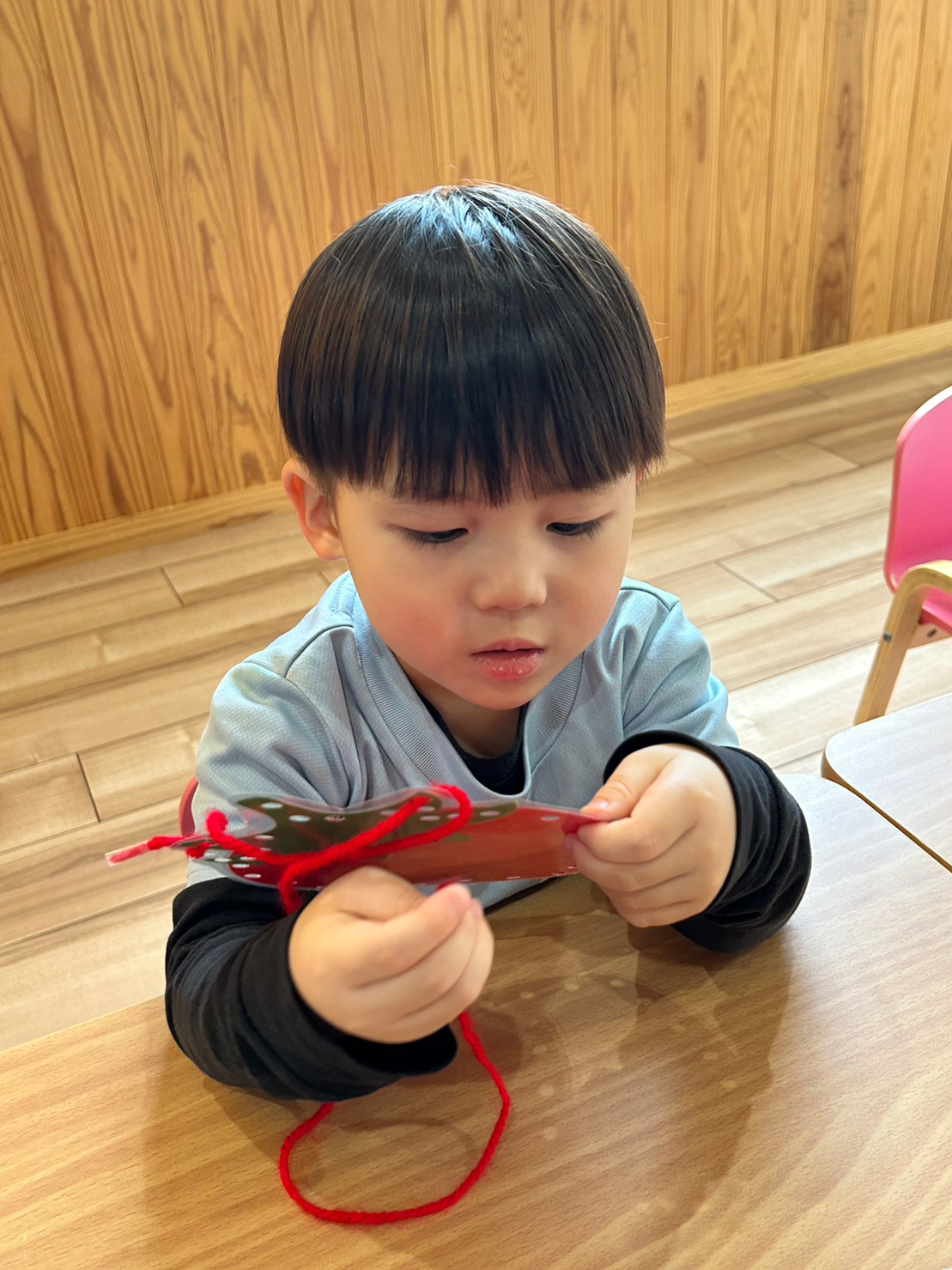 机上遊びで紐通しもしてみたり集中して過ごす時間も取ることができました😚