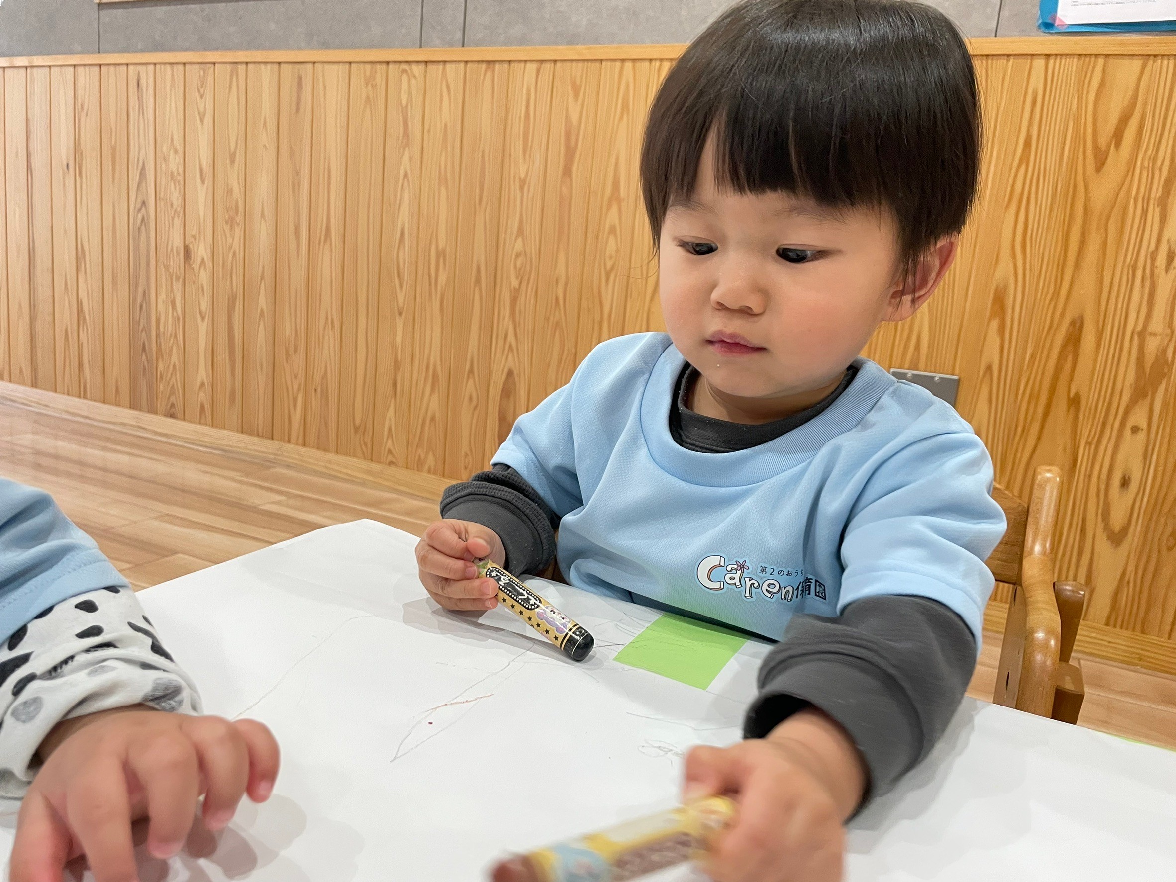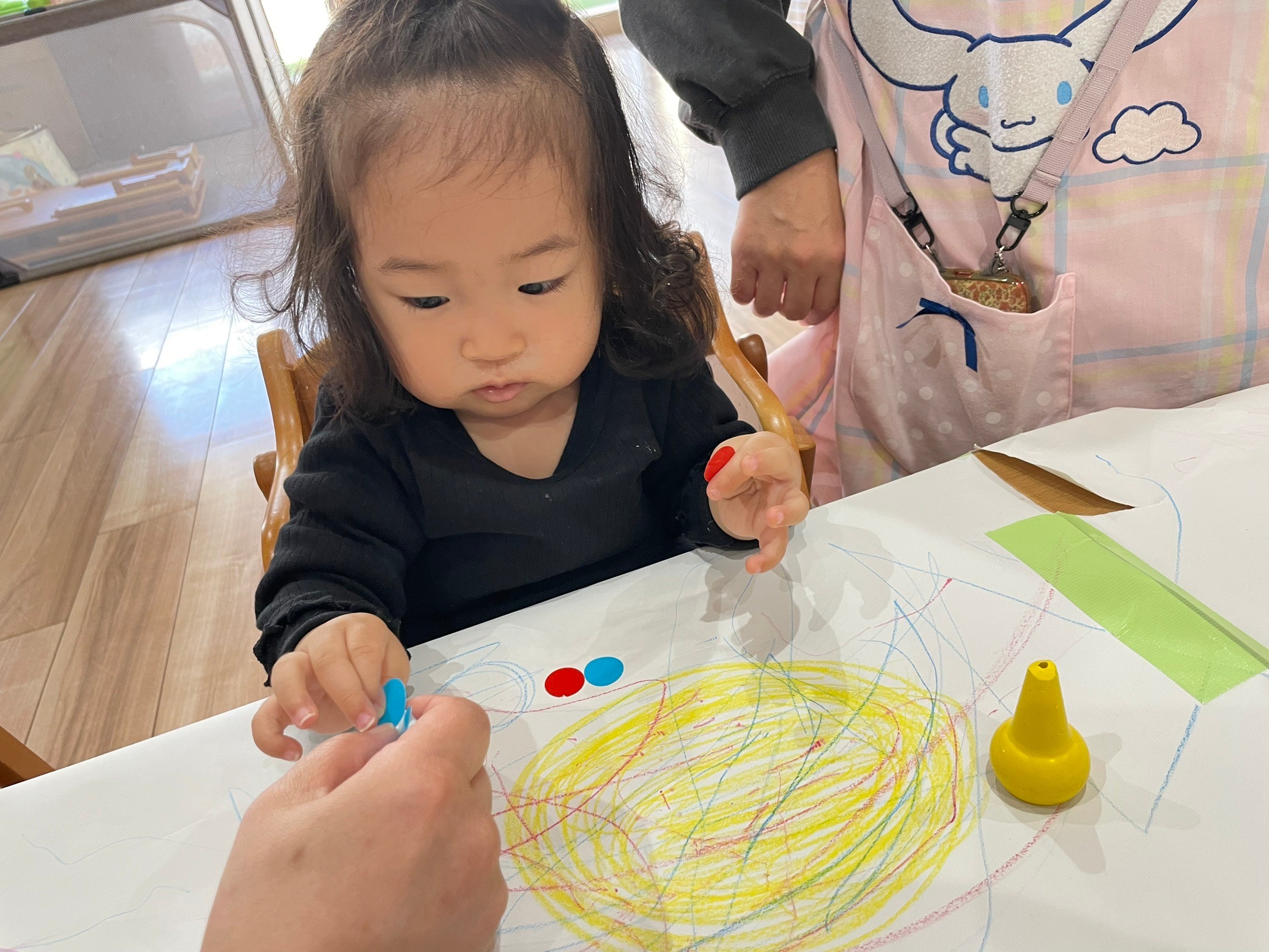 クレヨン遊びでは、みんなでクレヨンを手に一斉に描き出しました✨
