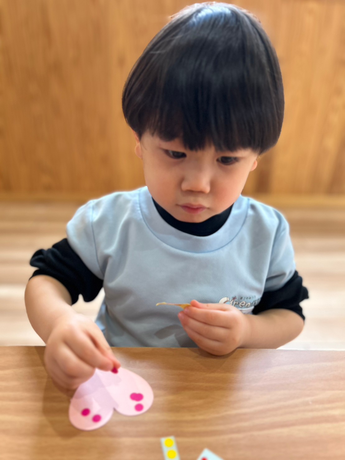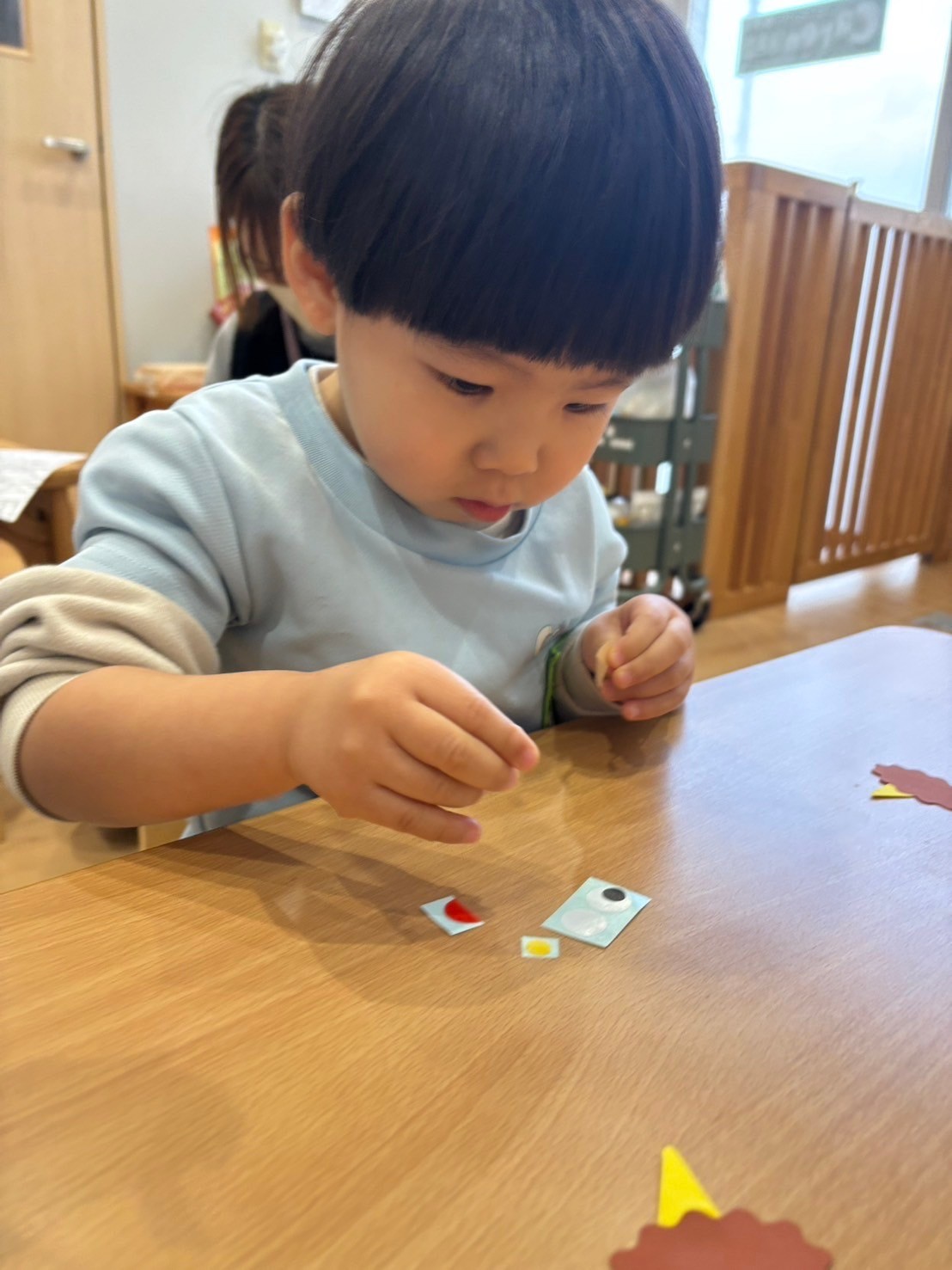 先生が描いてくれた絵を見つめているお友達も、自分で力強い線や点を描いていたお友達も、丸シールを渡すとすぐにシール貼りに夢中になっていました😆