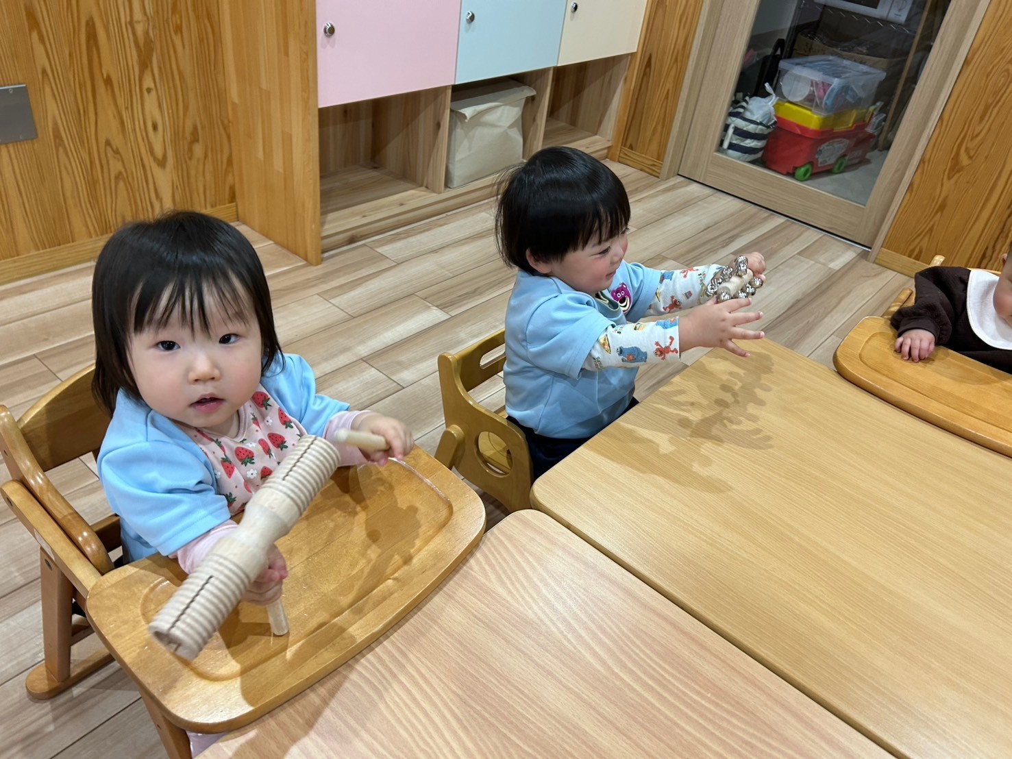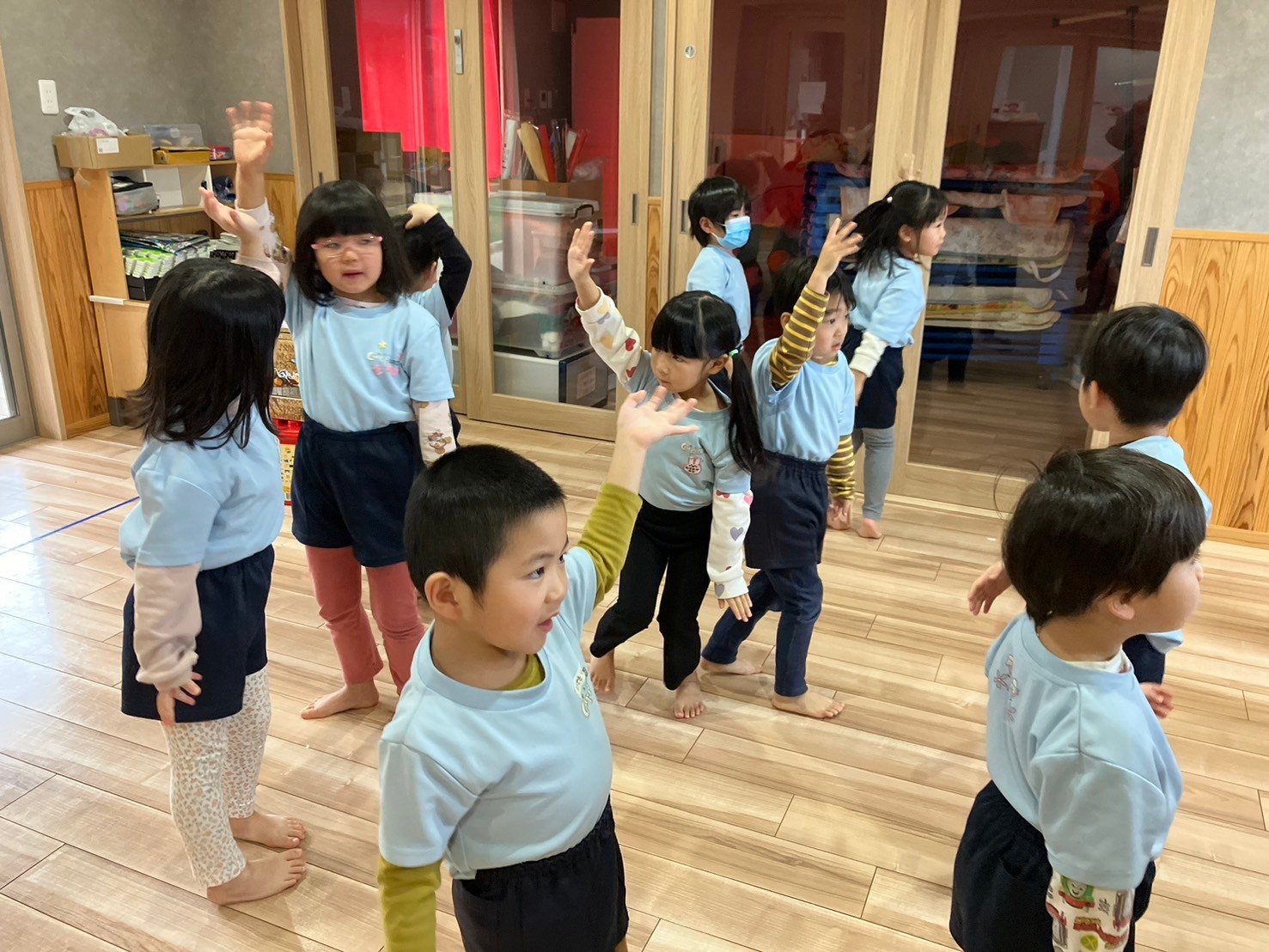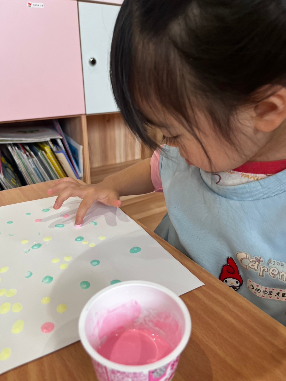 絵の具の間にトミカで少し遊んで、りす組からさくらんぼリズムのお誘いをしてもらったので一緒にしました🍒一緒に楽しむ園児もいれば、場所見知りで見学する園児もいました🤣うさぎ、こあら、きりん組