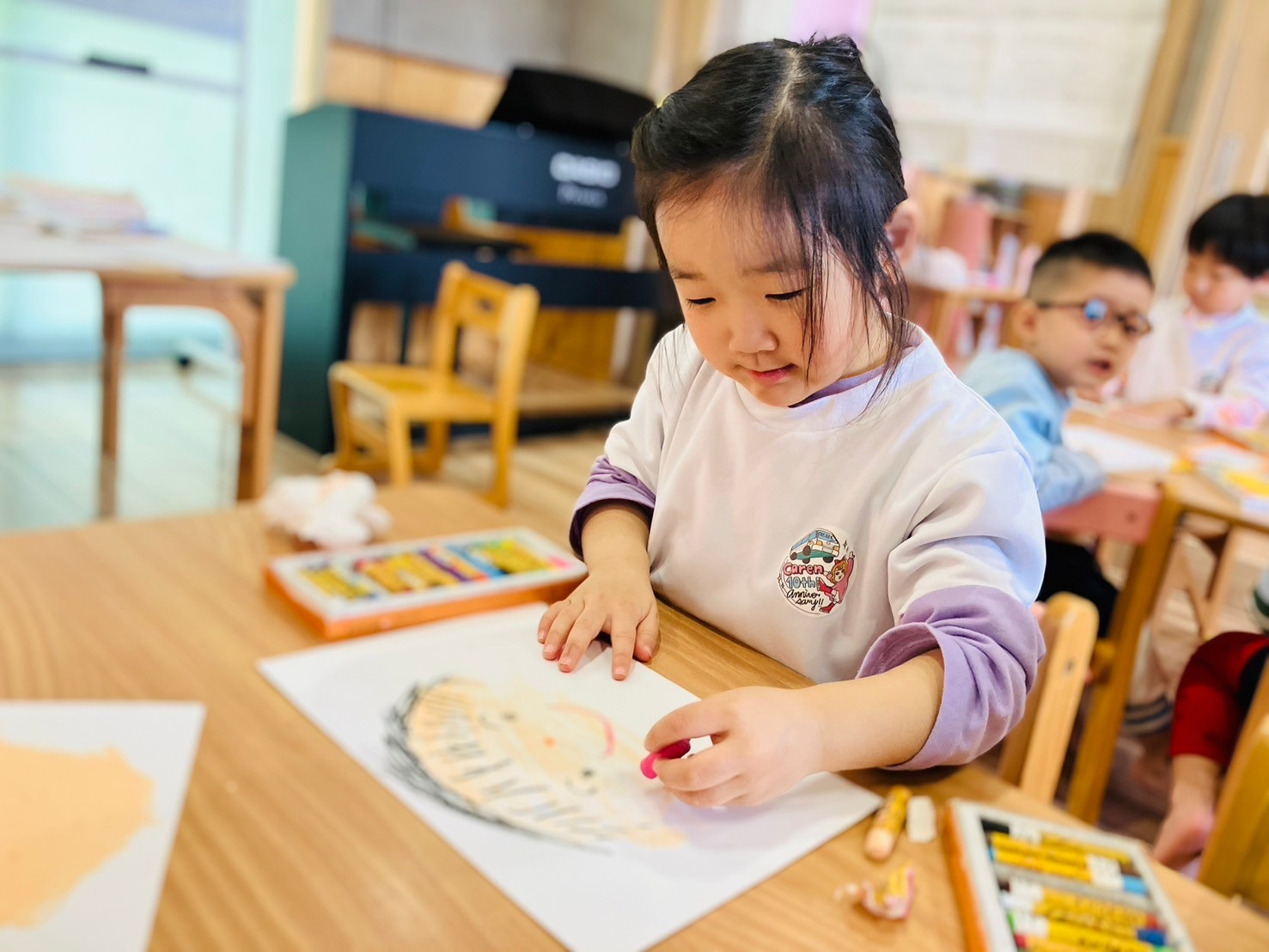 卒園するキリン組さんへのプレゼントで似顔絵を描きました🖍️クレパスの肌色が汚れていては綺麗な顔が描けないので