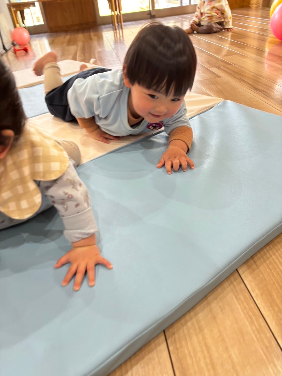 その後、静の動きでたっぷり集中したので動の動きでお部屋の中でボール遊びをしたりマットの上に乗ってせんせいに引っ張ってもらい空飛ぶ絨毯のようにバランスを保ちながら楽しみました💕マットの上でどんぐりで転がったり童歌あそびで大笑い🤣のひよこぐみさんでした☺️🎵最後に園庭で異年齢のクラスの子たちと触れあって遊びましたよ☀️🐿
