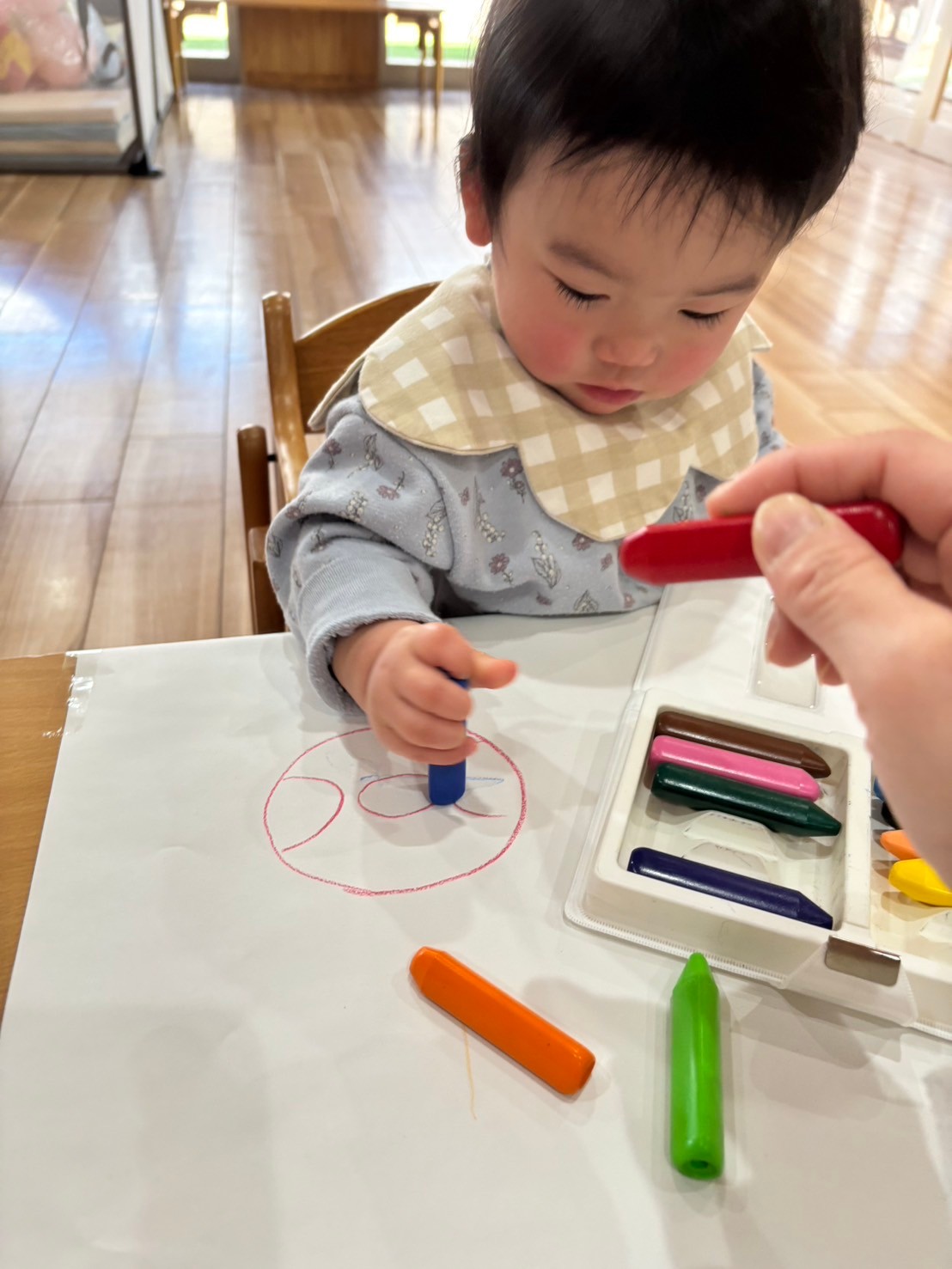 「これはあかいろだよー」と見せながら伝えていくと「あかー」と真似して言ったりと色にも興味を示していました✨グルグル🌀描いたり先生が描いた絵に色をつけたりして楽しみました🎵シール貼りもしていき高月齢児は上手に貼っていました👏
