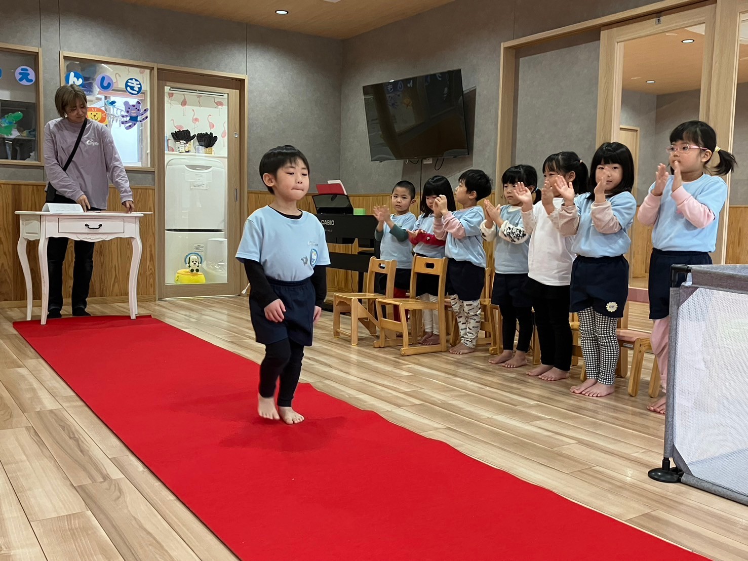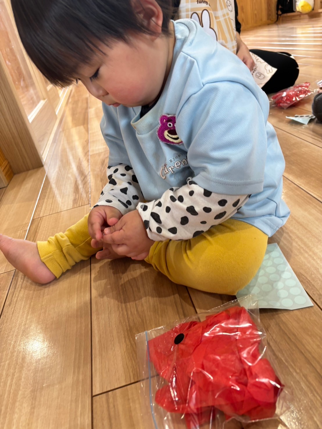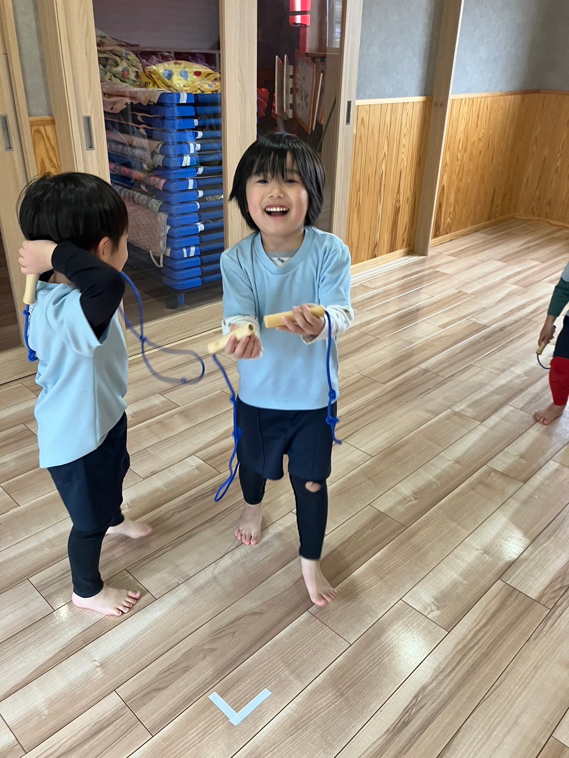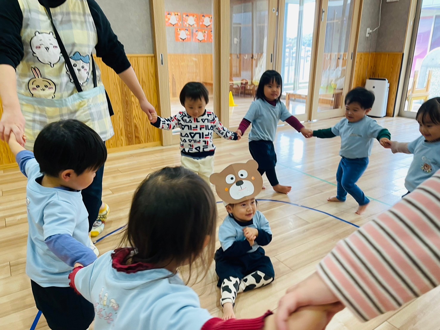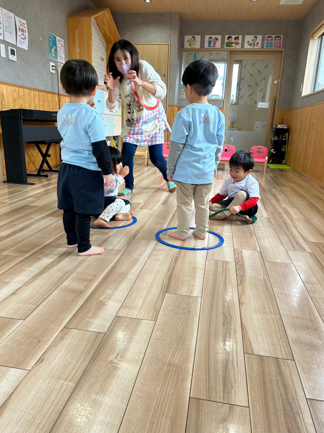 皆んなで「行こう🎵行こう🎵」と散歩をしていると「狼が来た!」で急いで輪っかのお家に逃げます💓お家が減っていって最後に残ったお友達の優勝🏆ルールは簡単ですが、素早いお友達が決まってきて白熱しても負けて悔しい思いもしました🥹次は「色鬼🩷」をしました🎵鬼さんが言った色の輪っかに入ります。「赤と青🩵!」と2つの色の時は少し難しかったようです😊