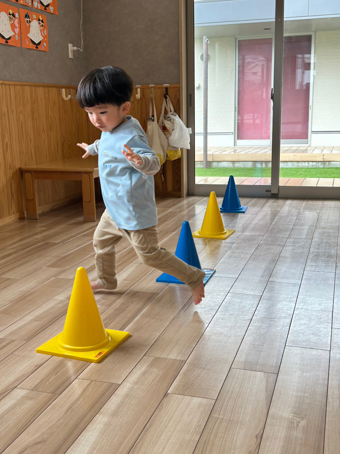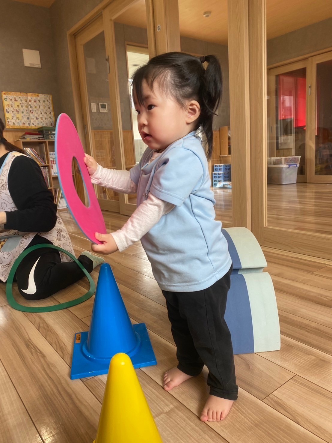 輪っかとポールでジグザグ遊びやぐーぐーぱー跳び⭕️もしました。以前よりリズミカルにとっても上手になっていましたよ😍