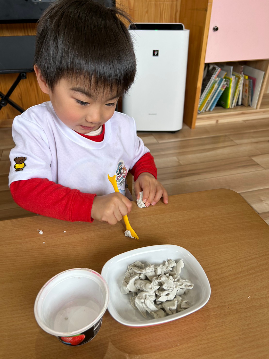 今日は小さな包丁やヘラでお料理を作ってみました❣️蛇さんのように長くしたり平にしたりしてトントンと切っていきます。「私かき氷🍧作ったよ」「僕はピザ🍕」「ブロッコリー🥦」「お野菜」とどんどんイメージが膨らんだようでした。アンパンマンが作れたお友達もいましたよ💓「交代して」「いいよ」のお約束も気持ちよく守れて楽しい粘土遊びになりました🥰ぱんだ🐼組