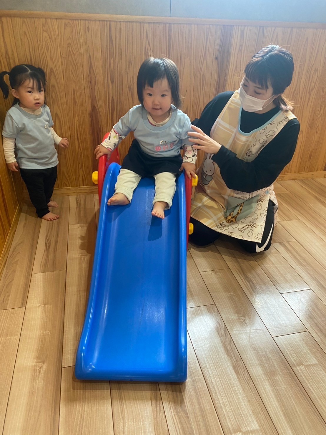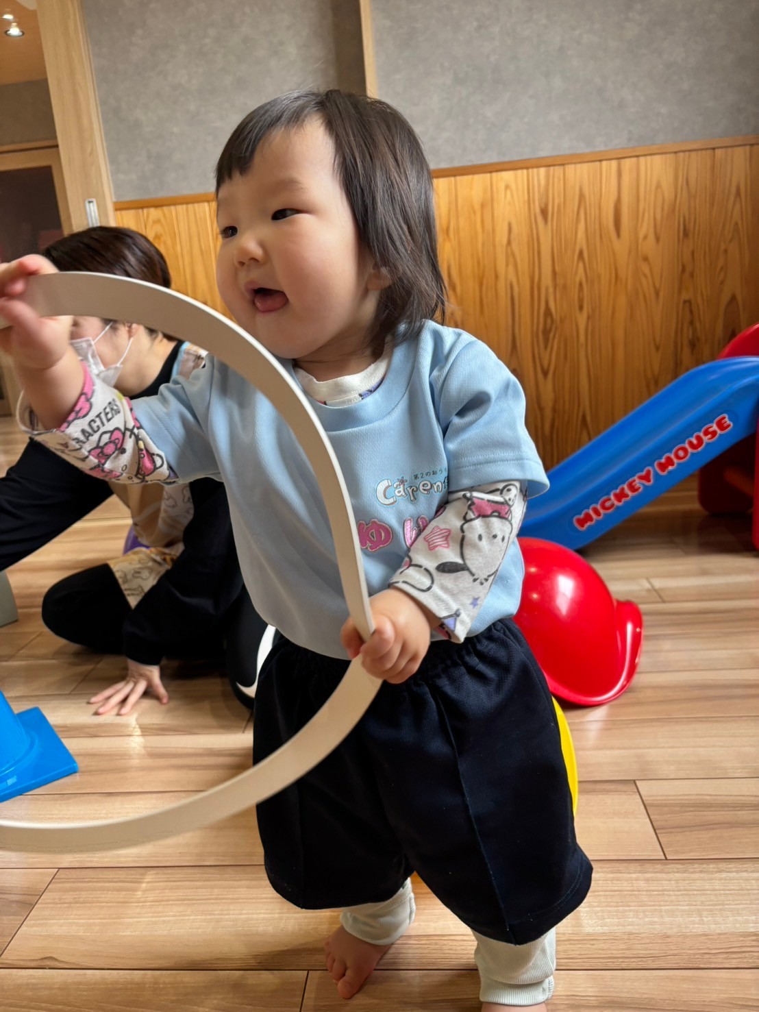 そして、色んな運動器具を使って遊んでいきました🤗滑り台の順番待ちも出来るようになりました🎶輪っかを持ってハンドルに見立てて♪バスに乗ってゆられてる〜の曲でノリノリで運転するひよこさんでした🐣りす組🐿️
