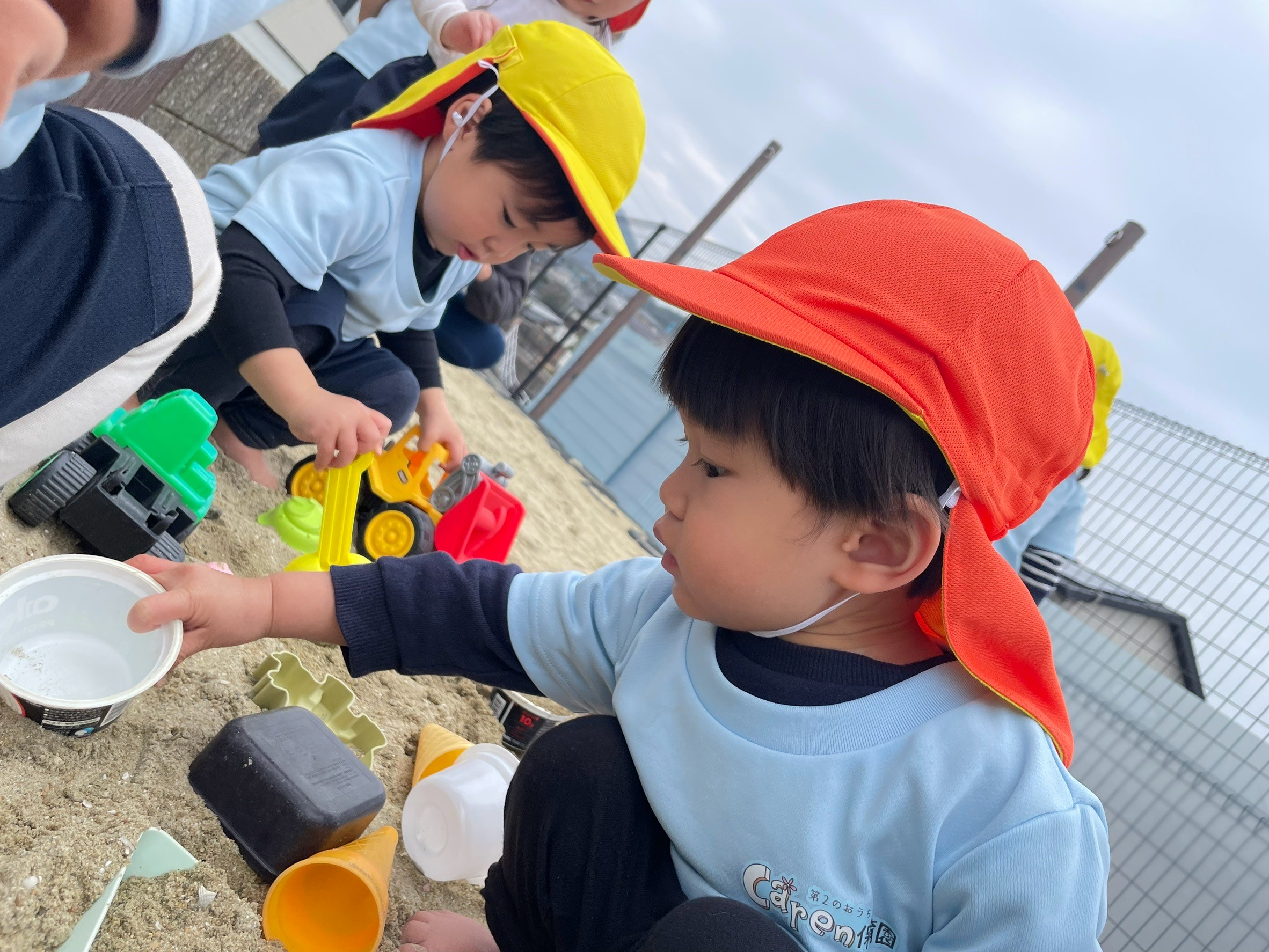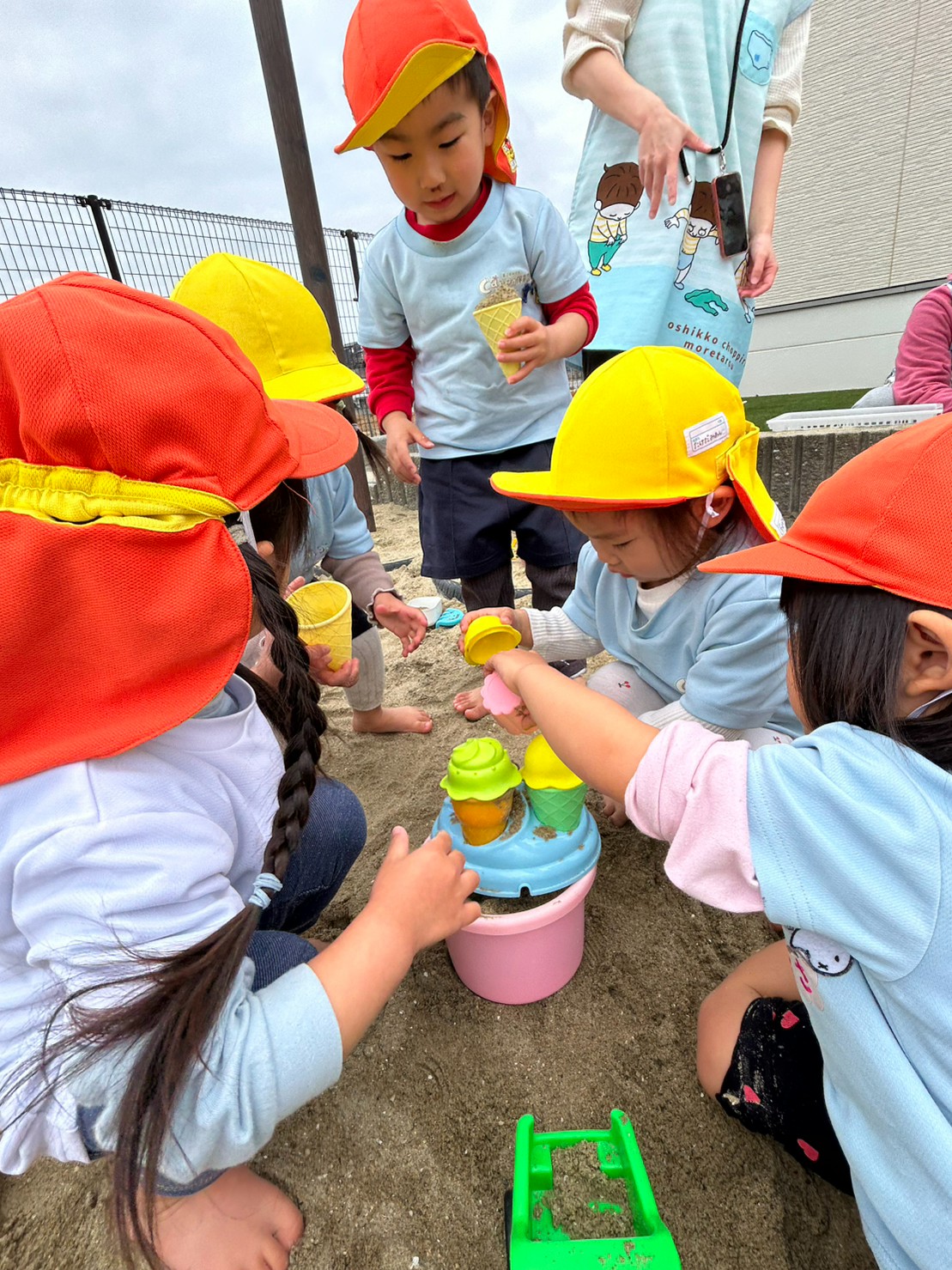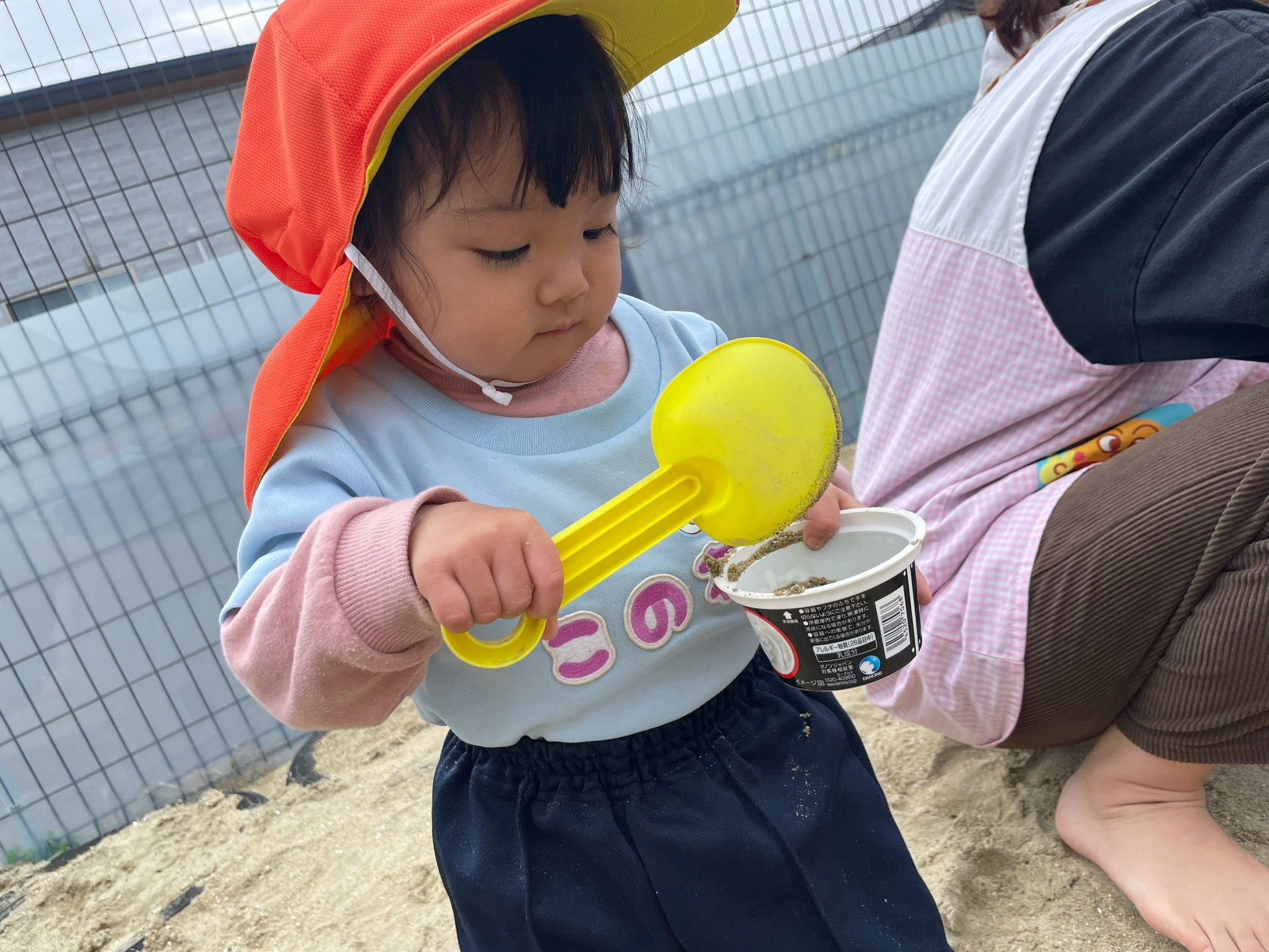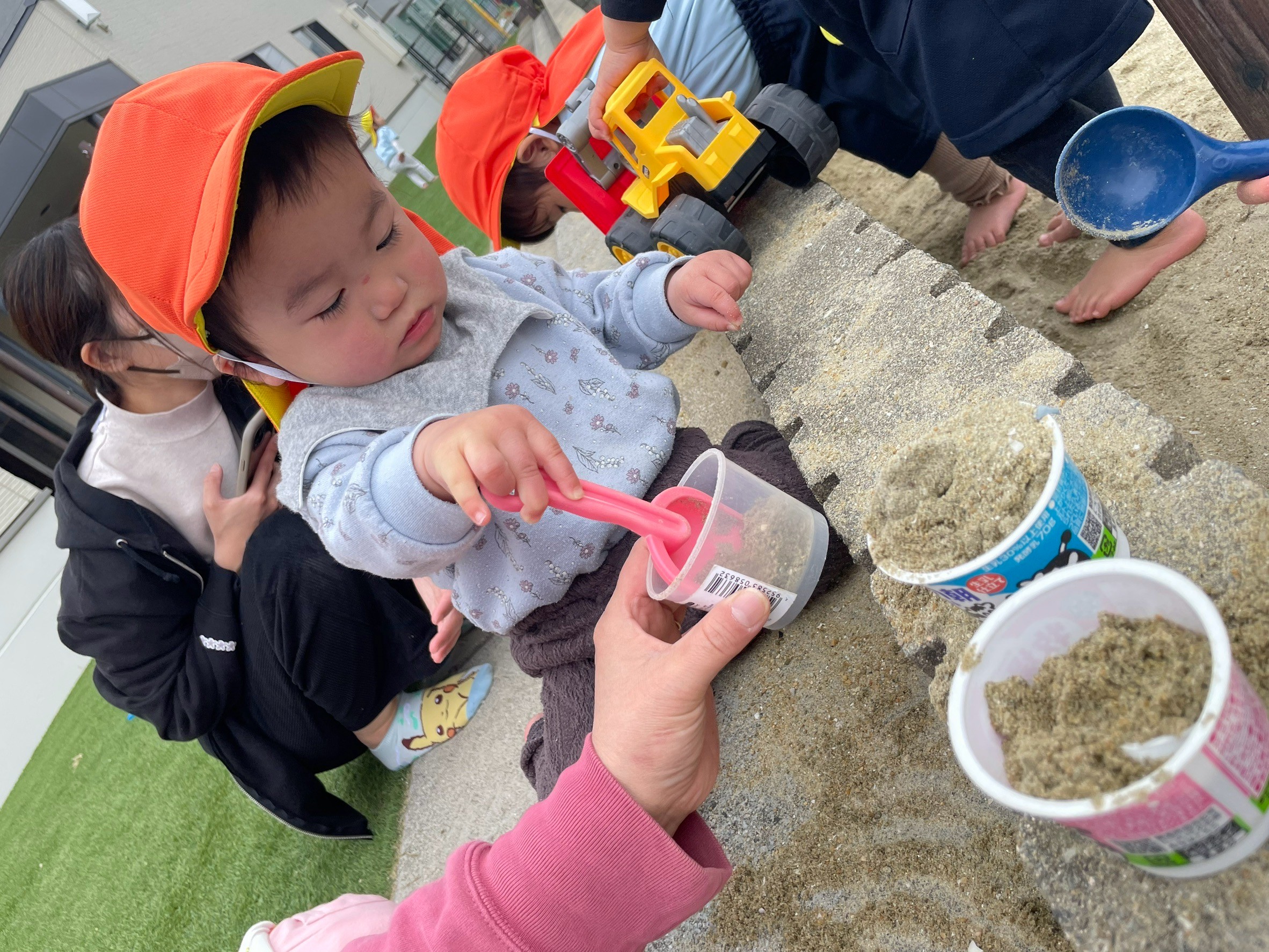 スコップで砂を集めてカップに入れたり、アイスを作って先生達に渡してくれましたよ💕