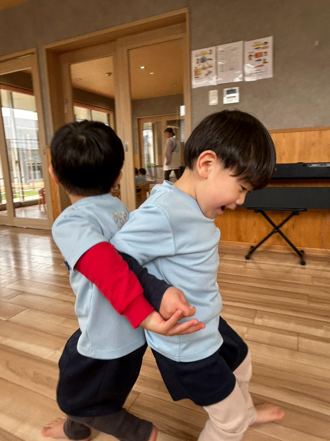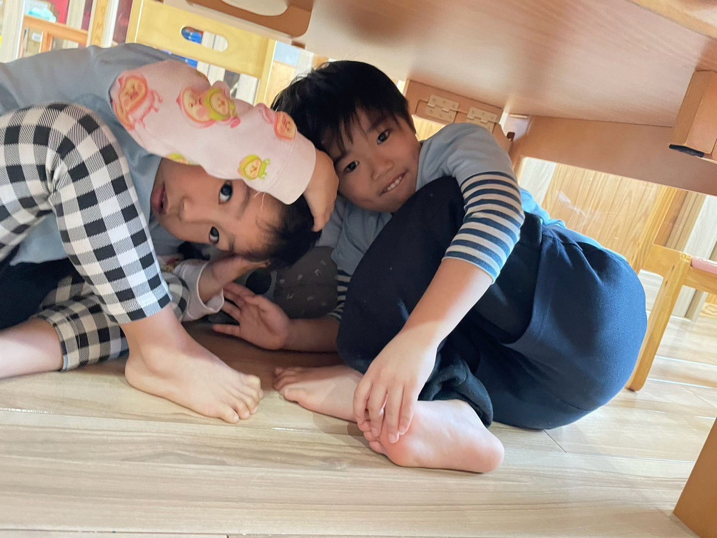 地震のサイレンが鳴ると、みんなで集まりダンゴムシのポーズを取りました✨