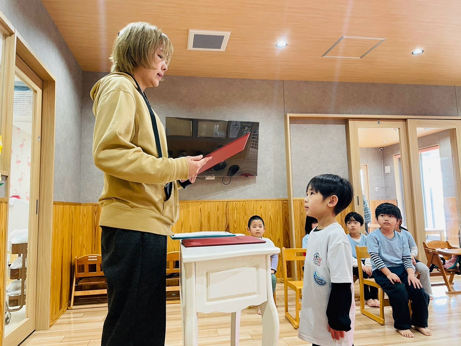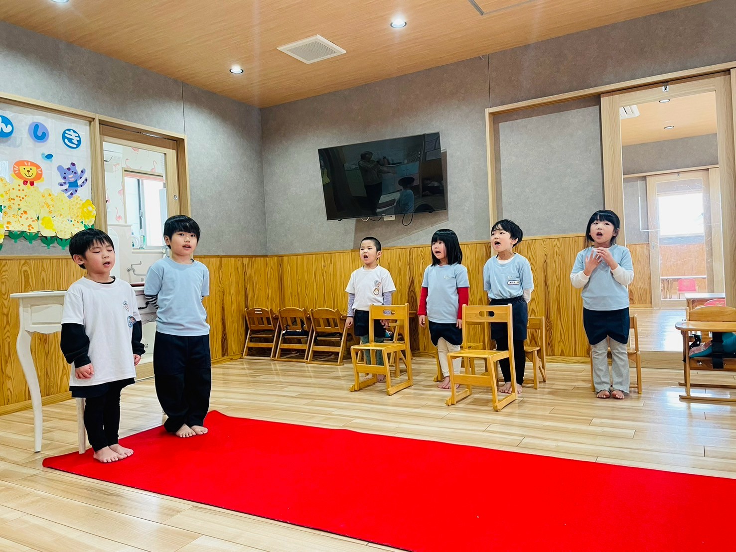 地震が起きたことを想定し、「緊急地震速報」を聞いてすぐに机の下に落ち着いて避難をすることができましたよ⭐️机の下でもっかりと頭を抱えたり丸くなることができていた以上児クラスのお友達でした✨その後は卒園式の練習をした後に、園庭で遊び楽しみましたよ😊🌱💞