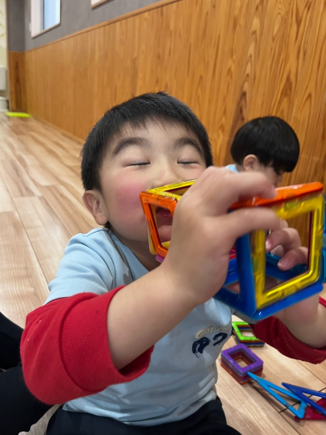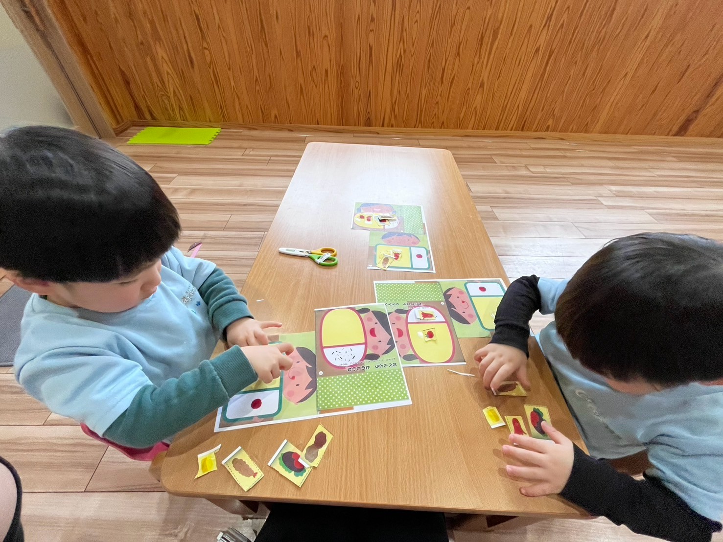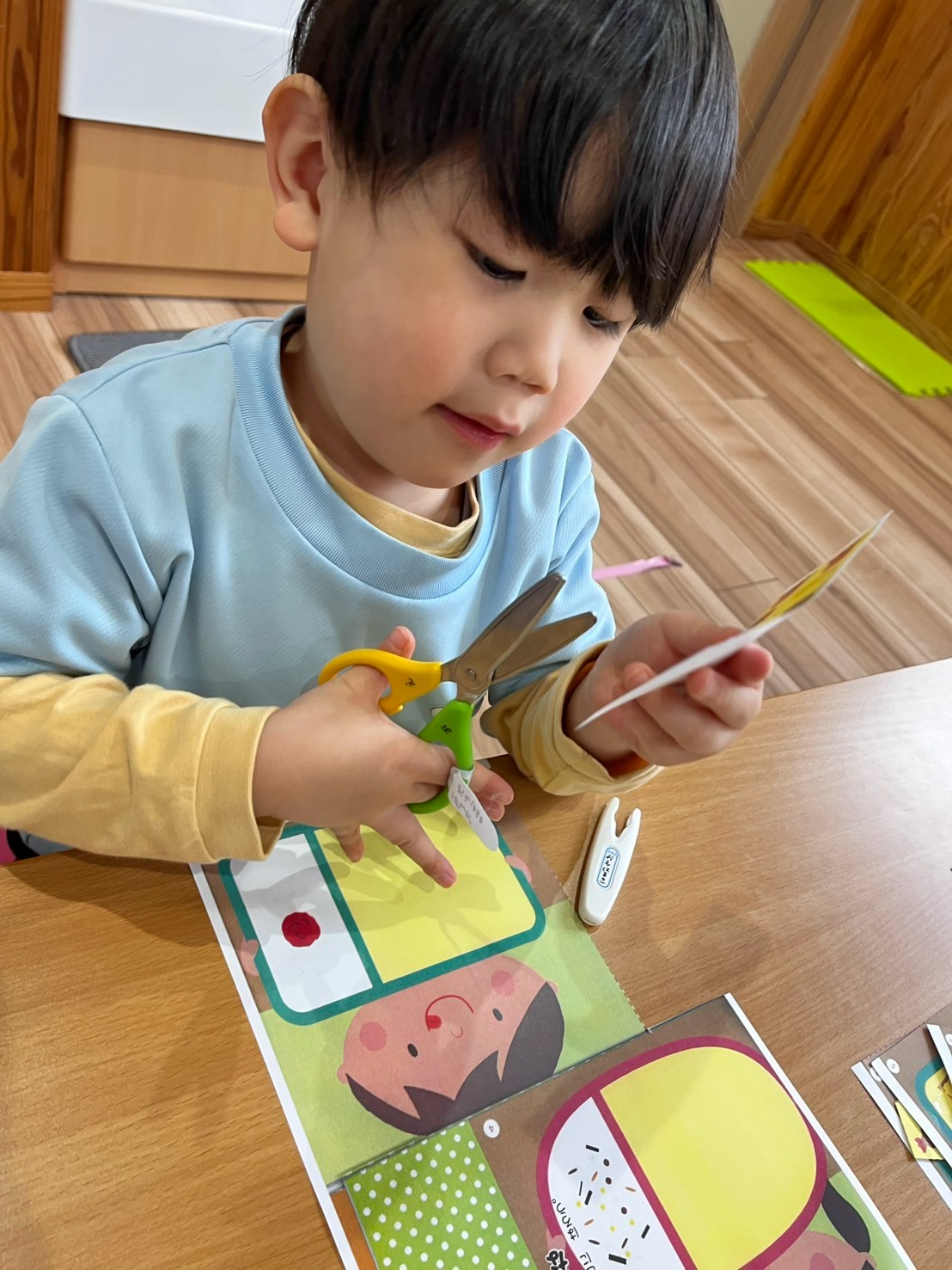今日はハサミの練習をしました✂️✨教材を使っておかずの絵がたくさん描いてある紙を自分たちで切り分けてお弁当に好きに飾りました🍱🩷ハサミの約束を確認したらみんなよく覚えていて怪我なく切り分けることができていました🥹✨順番を待つ間はマグブロックや恐竜の人形を使って仲良く遊びました🤭
