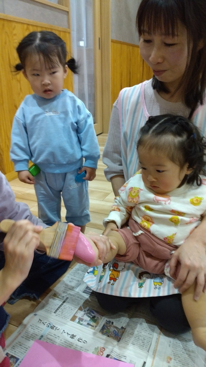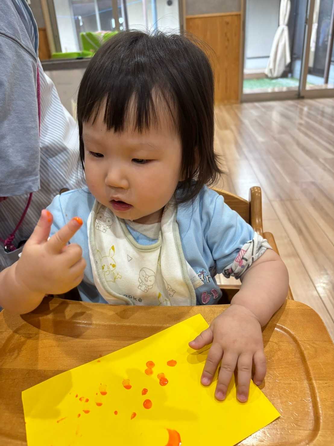順番に分かれてブロックをしたり、絵本をよんだりしていきました😍スタンプが気になるようで興味津々に順番を待っていましたよ✨足の裏に絵の具がついてくすぐったいような真剣に見つめていました🤣