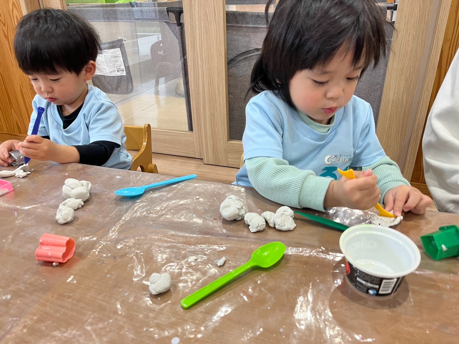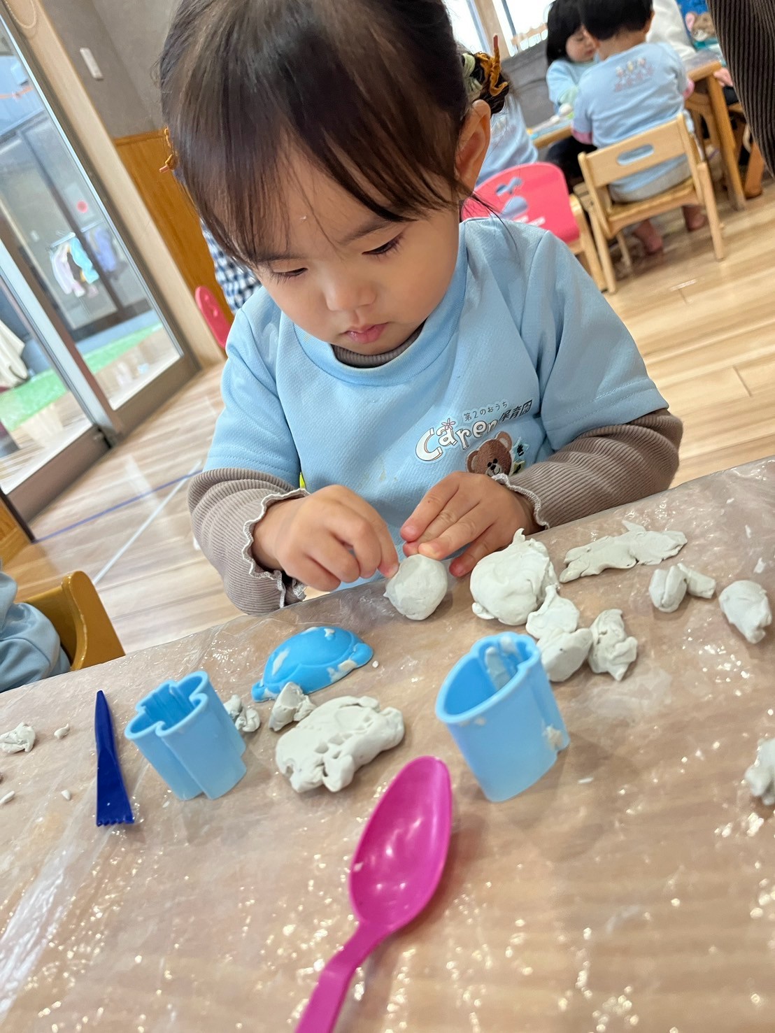 粘土遊びでは、捏ねて丸めて伸ばして🤍しっかり指先を使ったり、型やスプーンでおままごとを楽しんだり😘集中して遊ぶことが出来ましたよ🙌